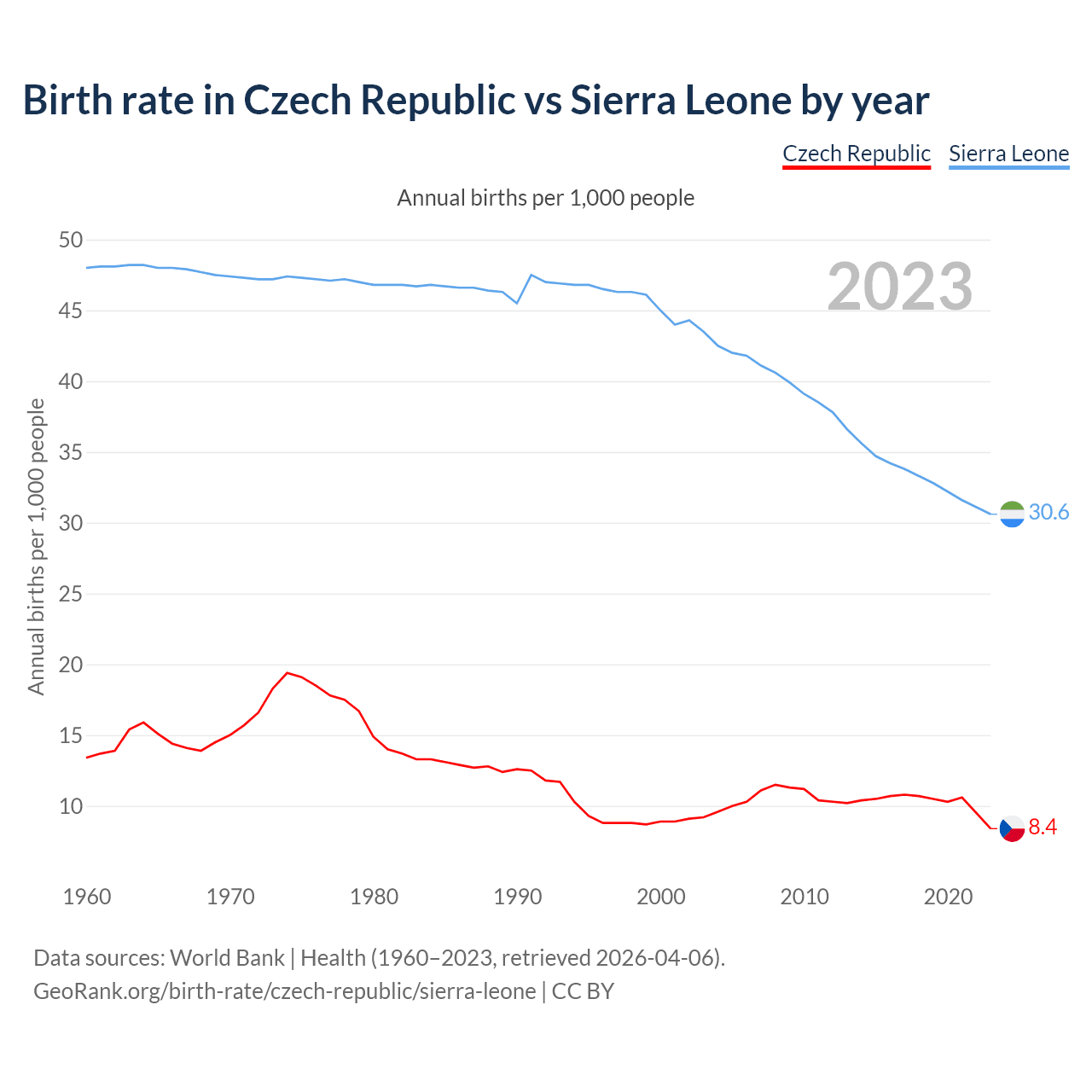 The Czech Republic has an annual birth rate of 8.4 births per 1,000 people, compared to 30.6 for Sierra Leone. The average number of children a woman is expected to have during her lifetime — the fertility rate, is 1.45 in the Czech Republic and 3.79 in Sierra Leone — 161.4% difference.