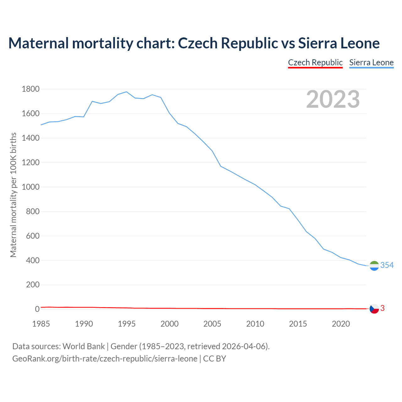 The maternal mortality rate, which is the probability of dying during childbirth or within 42 days of pregnancy termination, is 3 deaths per 100,000 live births in the Czech Republic, compared to 354 deaths in Sierra Leone.