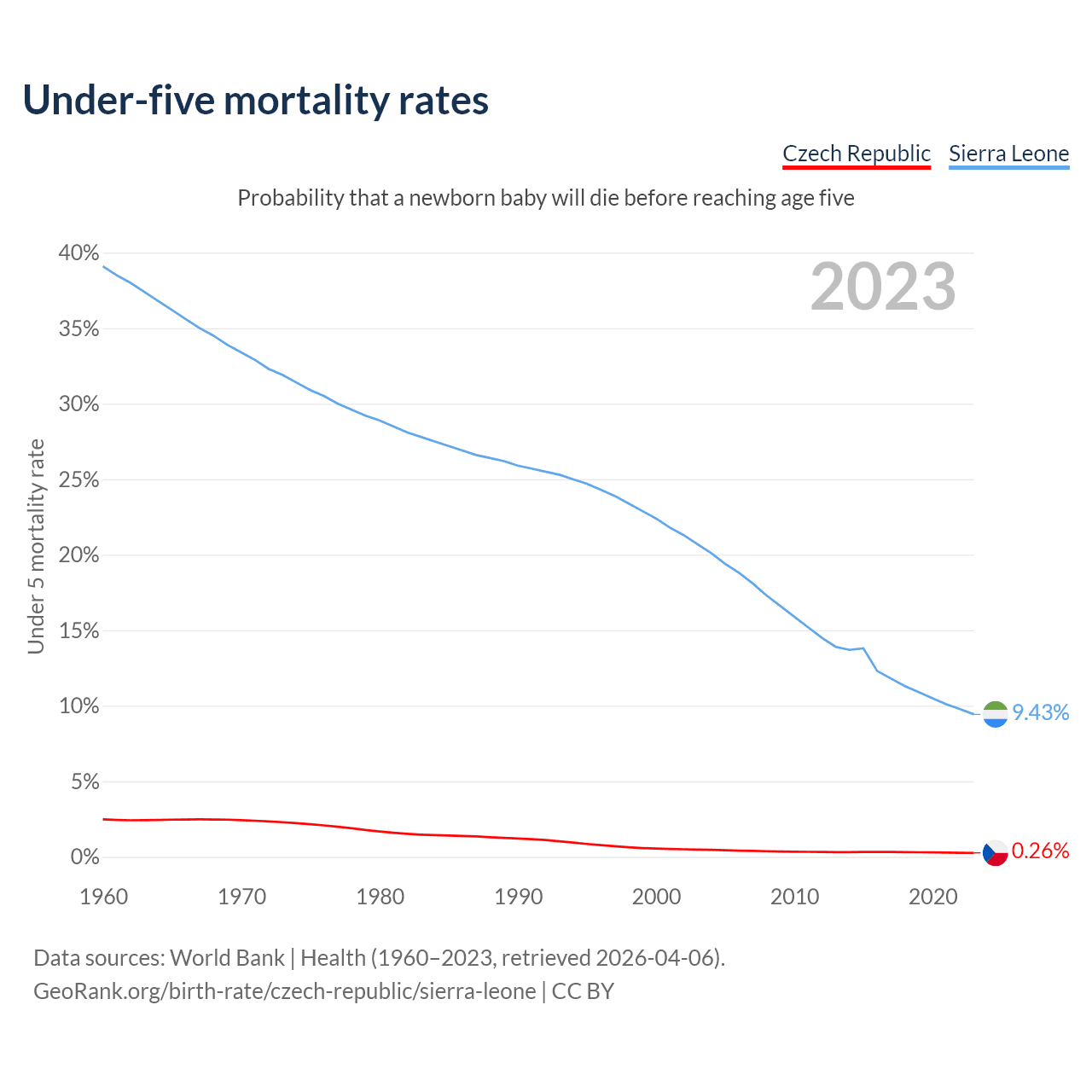 The chance that a newborn baby will die before reaching age five is 0.26% in the Czech Republic and 9.43% in Sierra Leone. Above is a chart with historical data on under-five mortality rates.