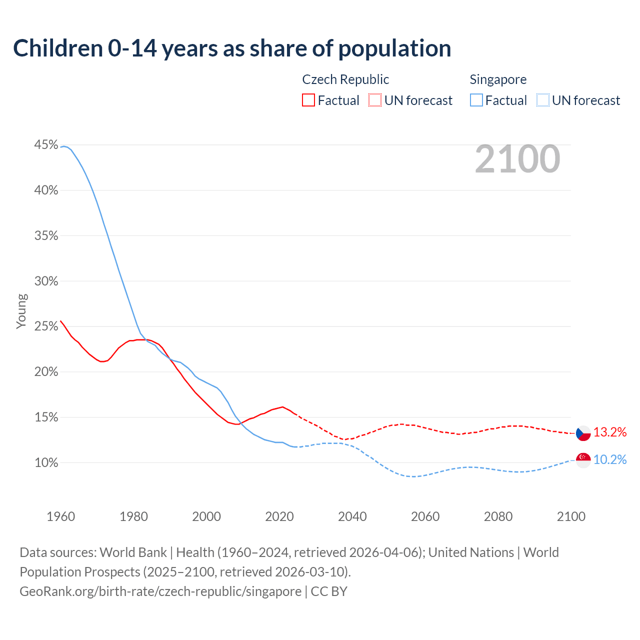 According to the latest available data on birth rates, the fertility rate in the Czech Republic was 1.45 children per woman in 2023, compared to 0.97 in Singapore in 2023. The replacement level is considered to be 2.1 children per woman.