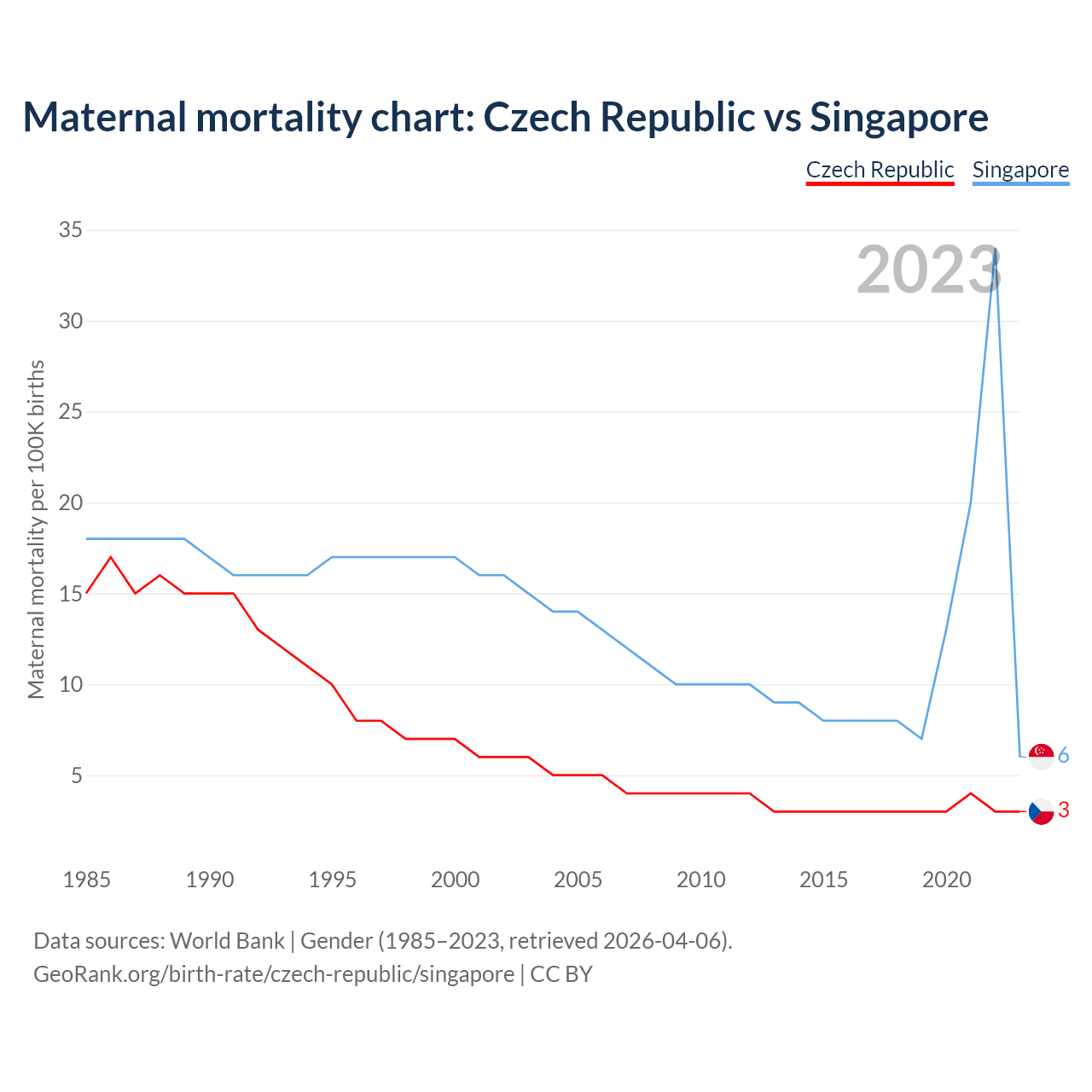 The maternal mortality rate, which is the probability of dying during childbirth or within 42 days of pregnancy termination, is 3 deaths per 100,000 live births in the Czech Republic, compared to 6 deaths in Singapore.