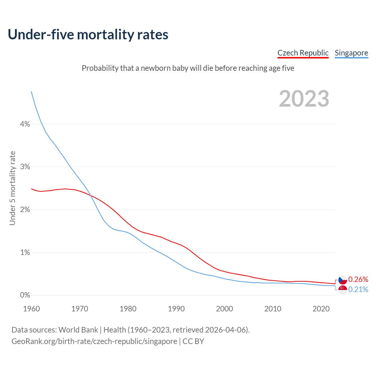 The chance that a newborn baby will die before reaching age five is 0.26% in the Czech Republic and 0.21% in Singapore. Above is a chart with historical data on under-five mortality rates.