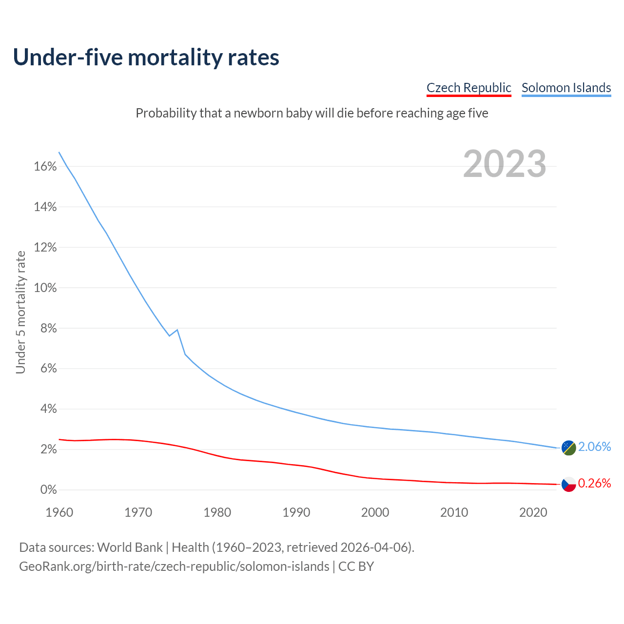 The chance that a newborn baby will die before reaching age five is 0.26% in the Czech Republic and 2.06% in the Solomon Islands. Above is a chart with historical data on under-five mortality rates.