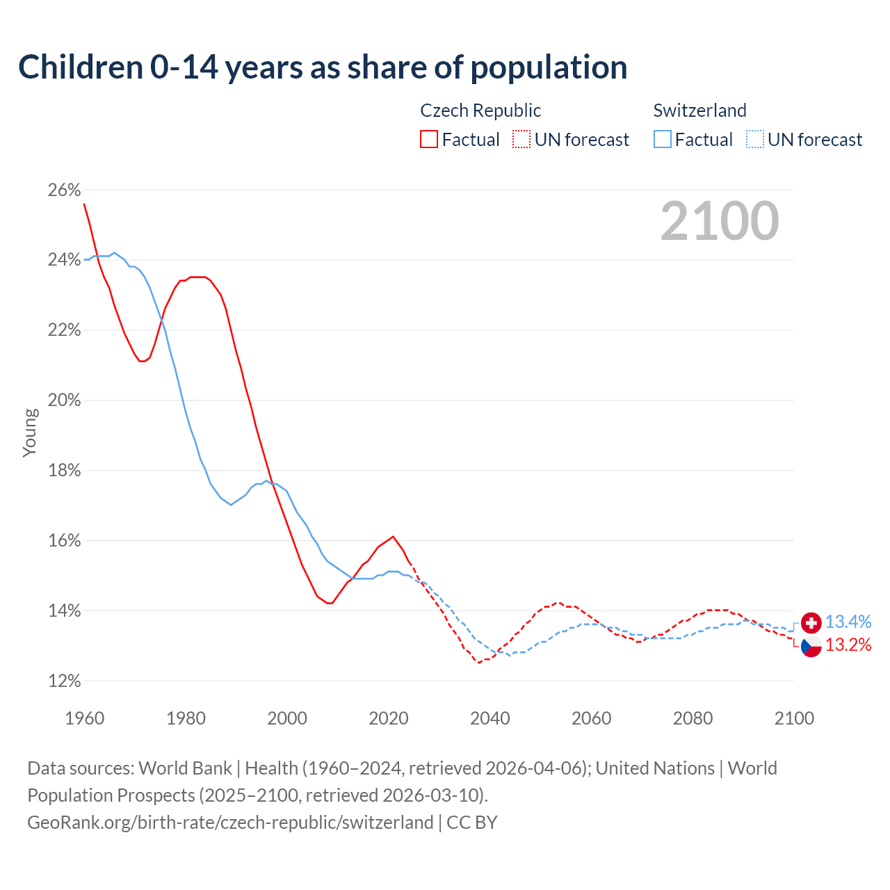 According to the latest available data on birth rates, the fertility rate in the Czech Republic was 1.45 children per woman in 2023, compared to 1.33 in Switzerland in 2023. The replacement level is considered to be 2.1 children per woman.