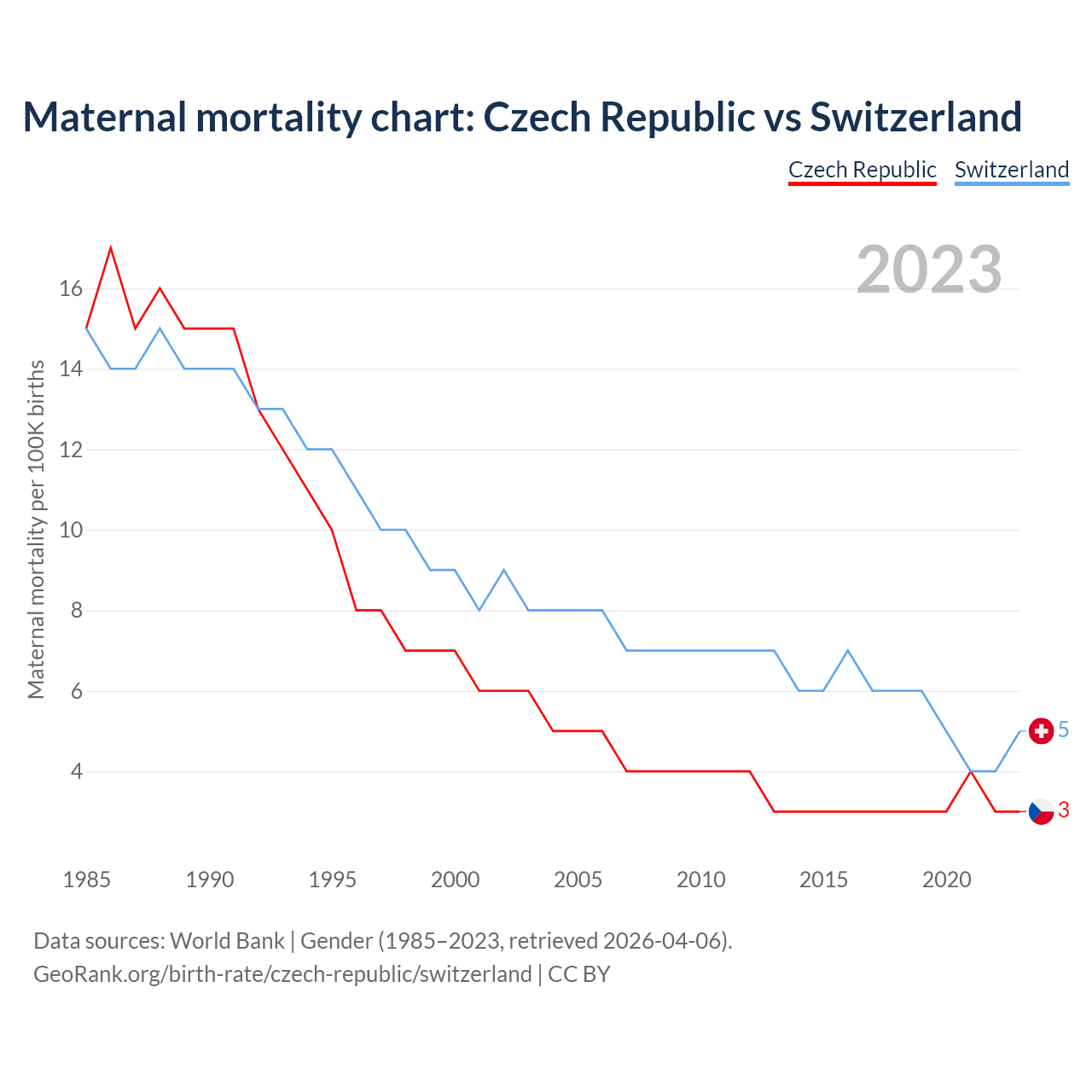 The maternal mortality rate, which is the probability of dying during childbirth or within 42 days of pregnancy termination, is 3 deaths per 100,000 live births in the Czech Republic, compared to 5 deaths in Switzerland.