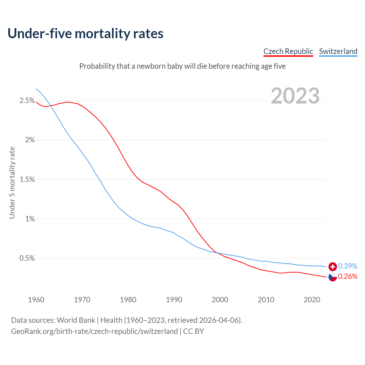 The chance that a newborn baby will die before reaching age five is 0.26% in the Czech Republic and 0.39% in Switzerland. Above is a chart with historical data on under-five mortality rates.