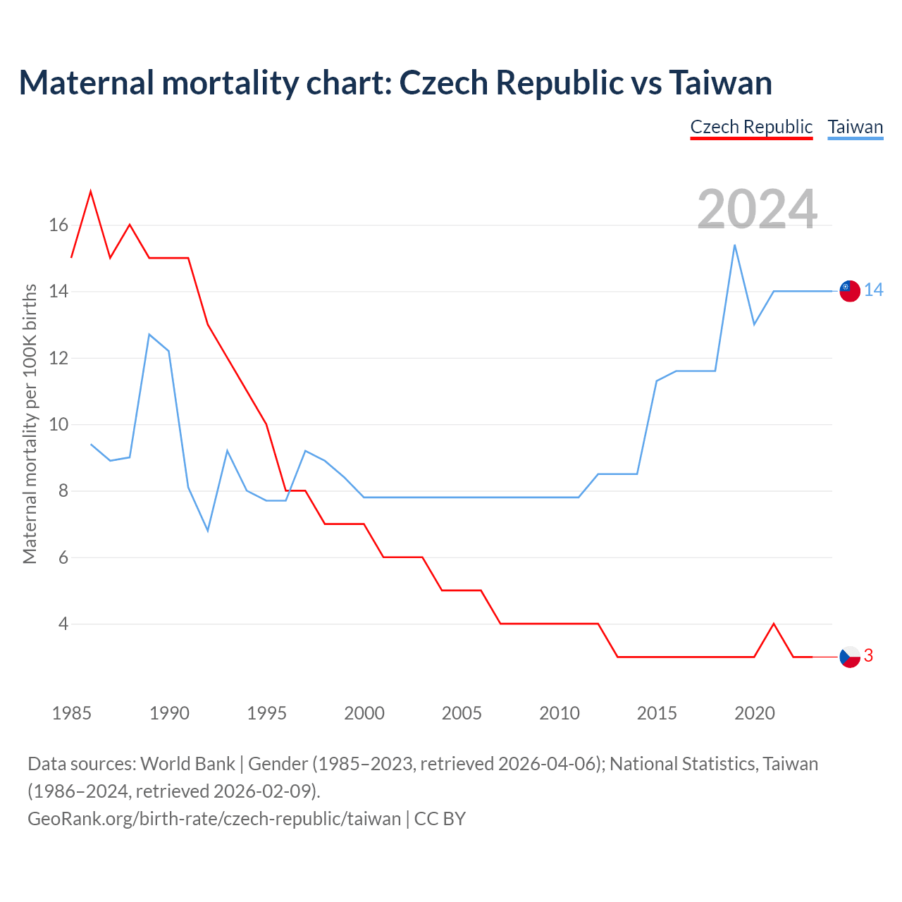 The maternal mortality rate, which is the probability of dying during childbirth or within 42 days of pregnancy termination, is 3 deaths per 100,000 live births in the Czech Republic, compared to 14 deaths in Taiwan.