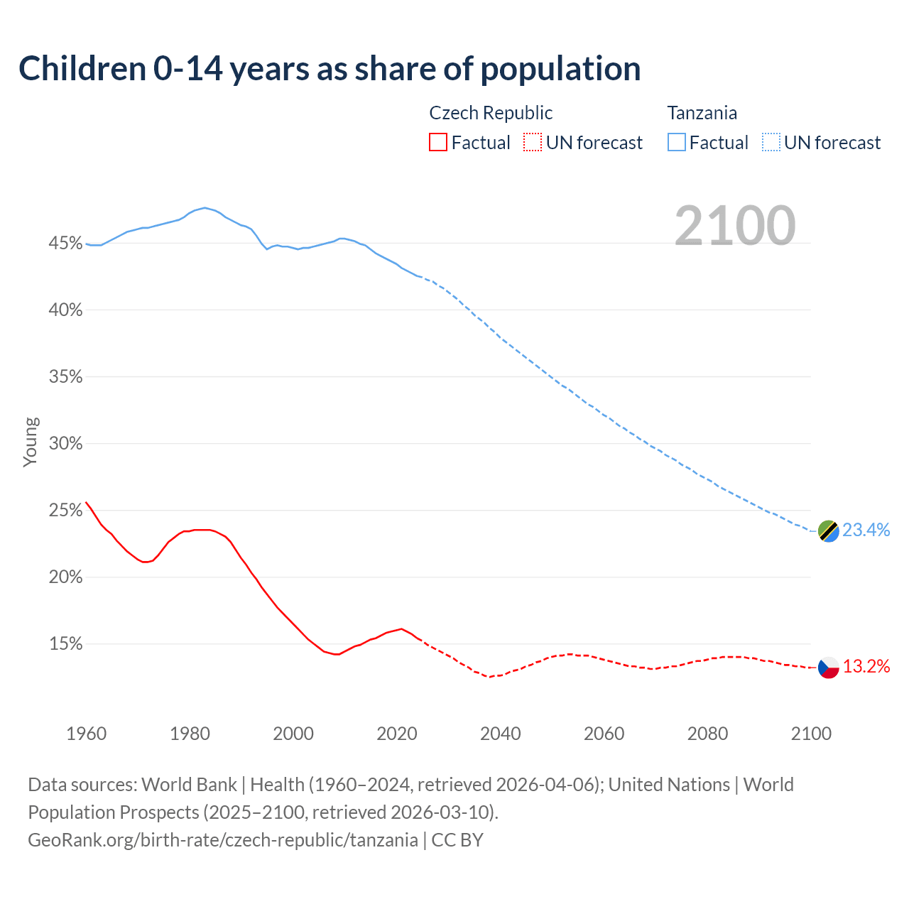 According to the latest available data on birth rates, the fertility rate in the Czech Republic was 1.45 children per woman in 2023, compared to 4.61 in Tanzania in 2023. The replacement level is considered to be 2.1 children per woman.