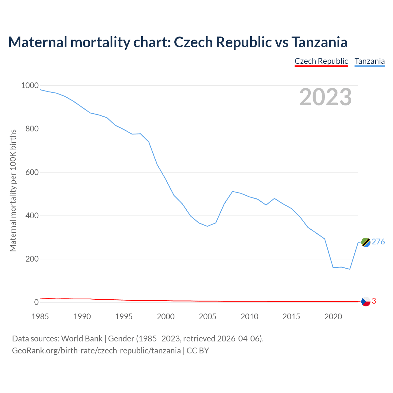 The maternal mortality rate, which is the probability of dying during childbirth or within 42 days of pregnancy termination, is 3 deaths per 100,000 live births in the Czech Republic, compared to 276 deaths in Tanzania.