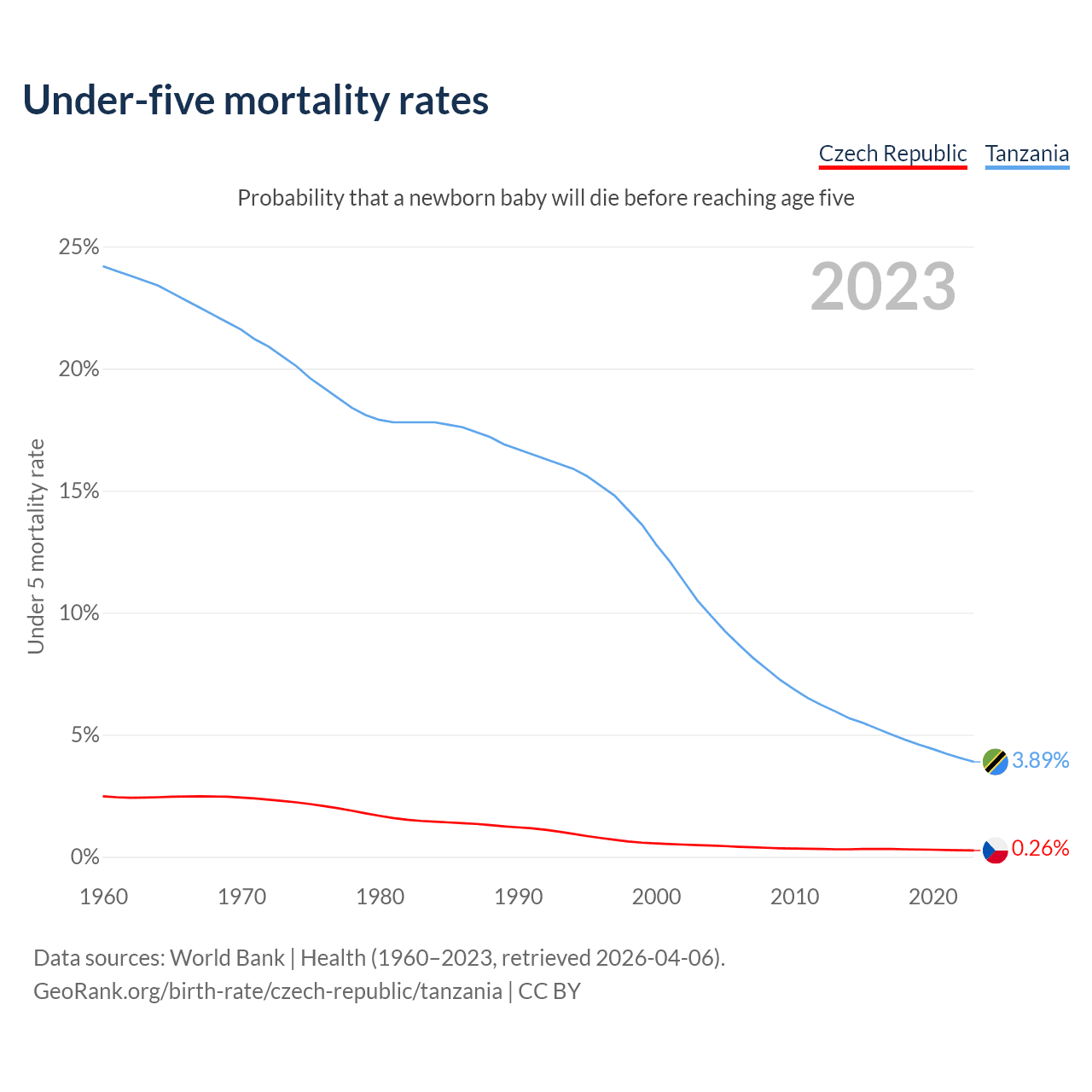 The chance that a newborn baby will die before reaching age five is 0.26% in the Czech Republic and 3.89% in Tanzania. Above is a chart with historical data on under-five mortality rates.