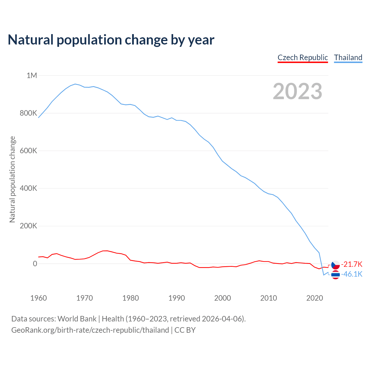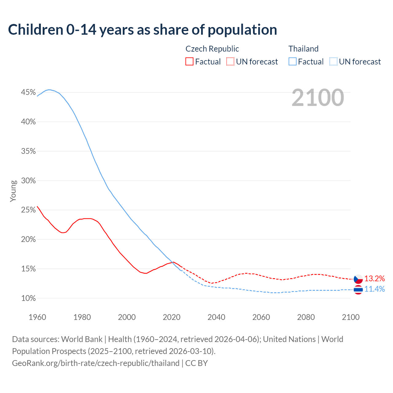 According to the latest available data on birth rates, the fertility rate in the Czech Republic was 1.45 children per woman in 2023, compared to 1.21 in Thailand in 2023. The replacement level is considered to be 2.1 children per woman.