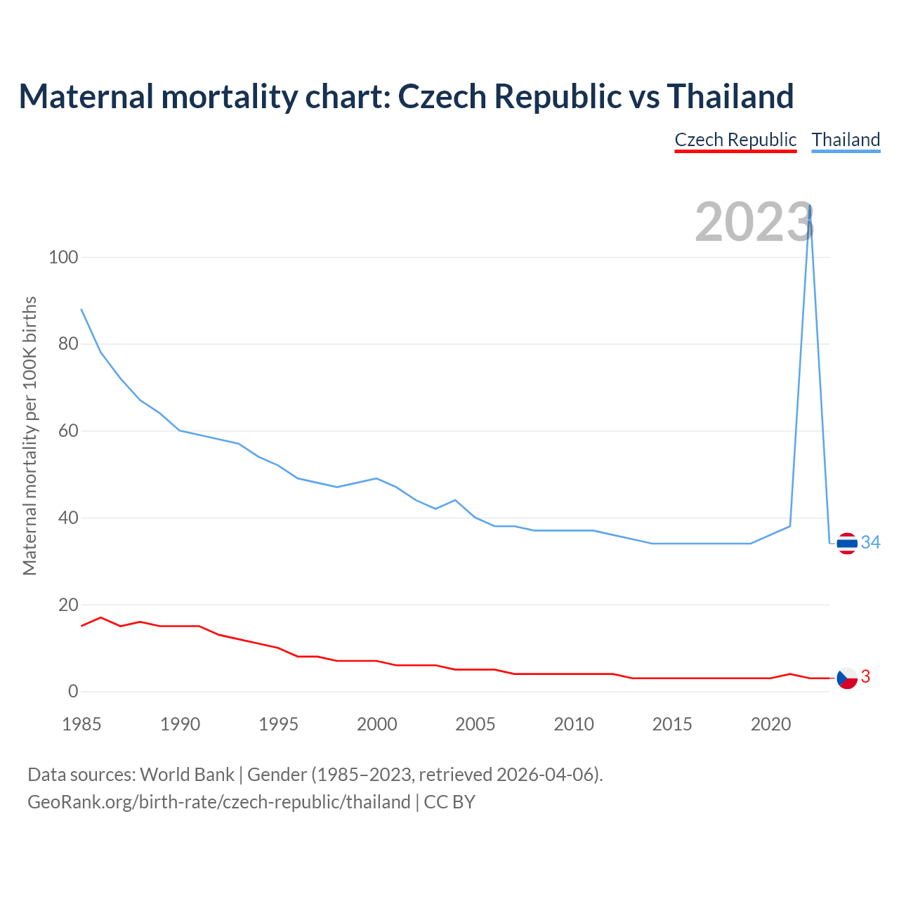The maternal mortality rate, which is the probability of dying during childbirth or within 42 days of pregnancy termination, is 3 deaths per 100,000 live births in the Czech Republic, compared to 34 deaths in Thailand.
