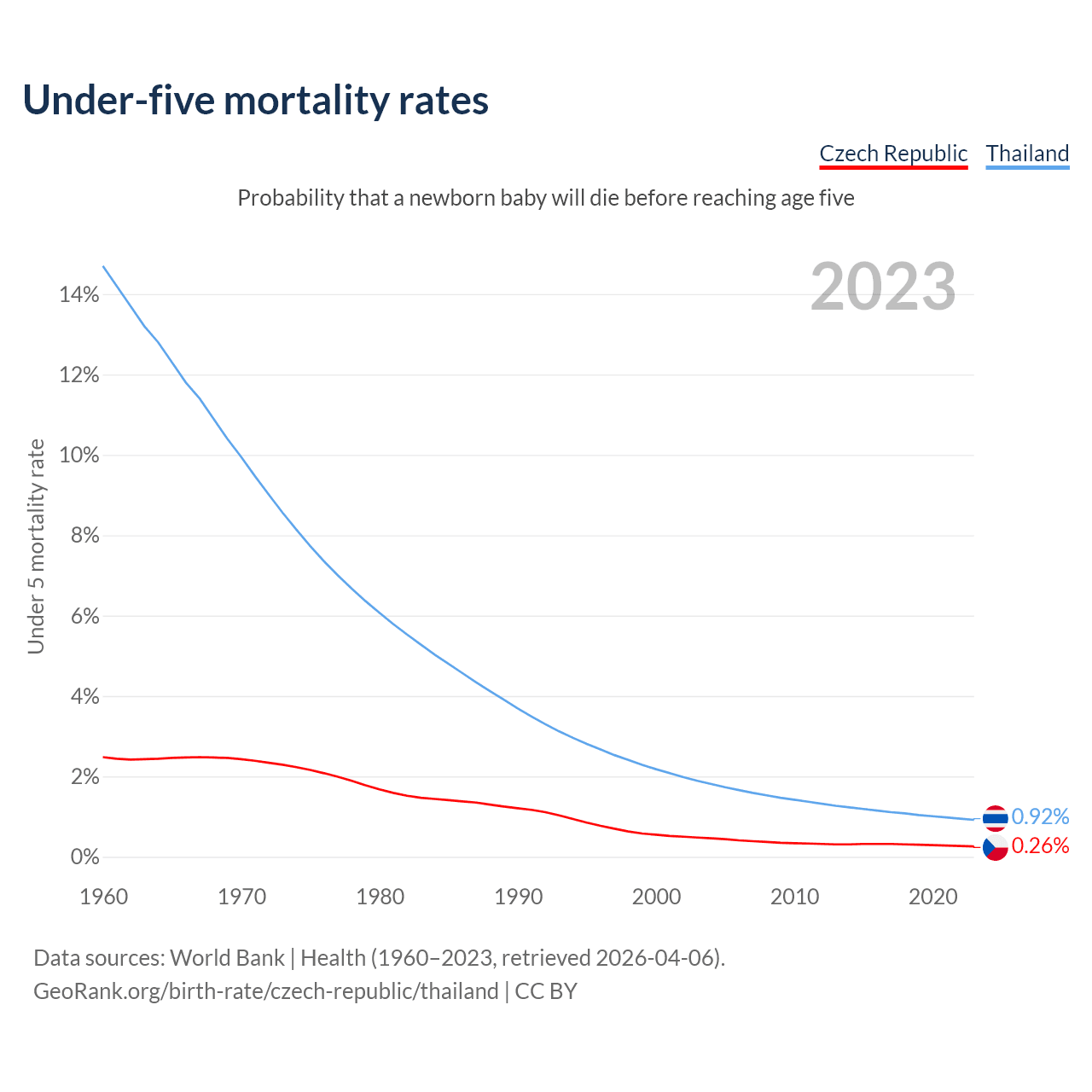 The chance that a newborn baby will die before reaching age five is 0.26% in the Czech Republic and 0.92% in Thailand. Above is a chart with historical data on under-five mortality rates.
