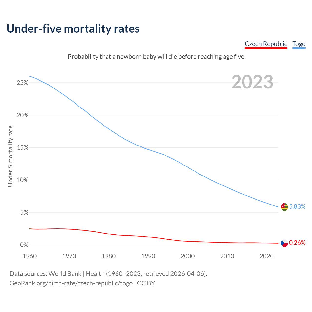 The chance that a newborn baby will die before reaching age five is 0.26% in the Czech Republic and 5.83% in Togo. Above is a chart with historical data on under-five mortality rates.