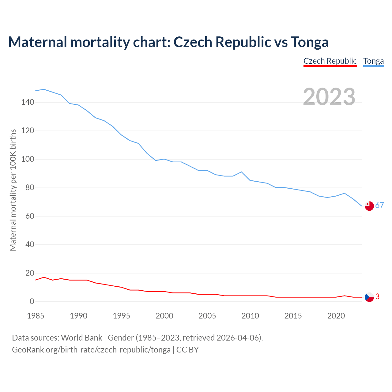 The maternal mortality rate, which is the probability of dying during childbirth or within 42 days of pregnancy termination, is 3 deaths per 100,000 live births in the Czech Republic, compared to 67 deaths in Tonga.