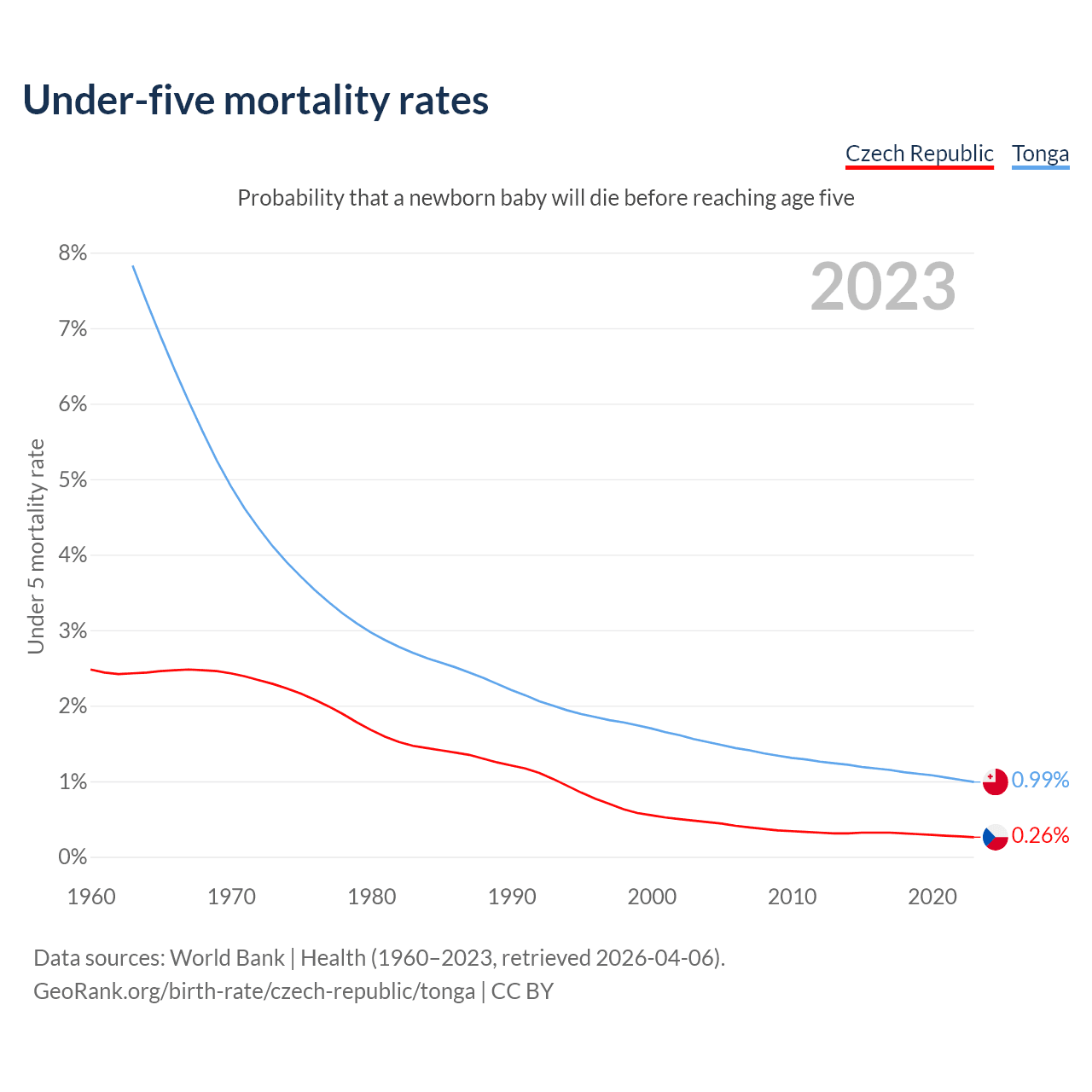 The chance that a newborn baby will die before reaching age five is 0.26% in the Czech Republic and 0.99% in Tonga. Above is a chart with historical data on under-five mortality rates.