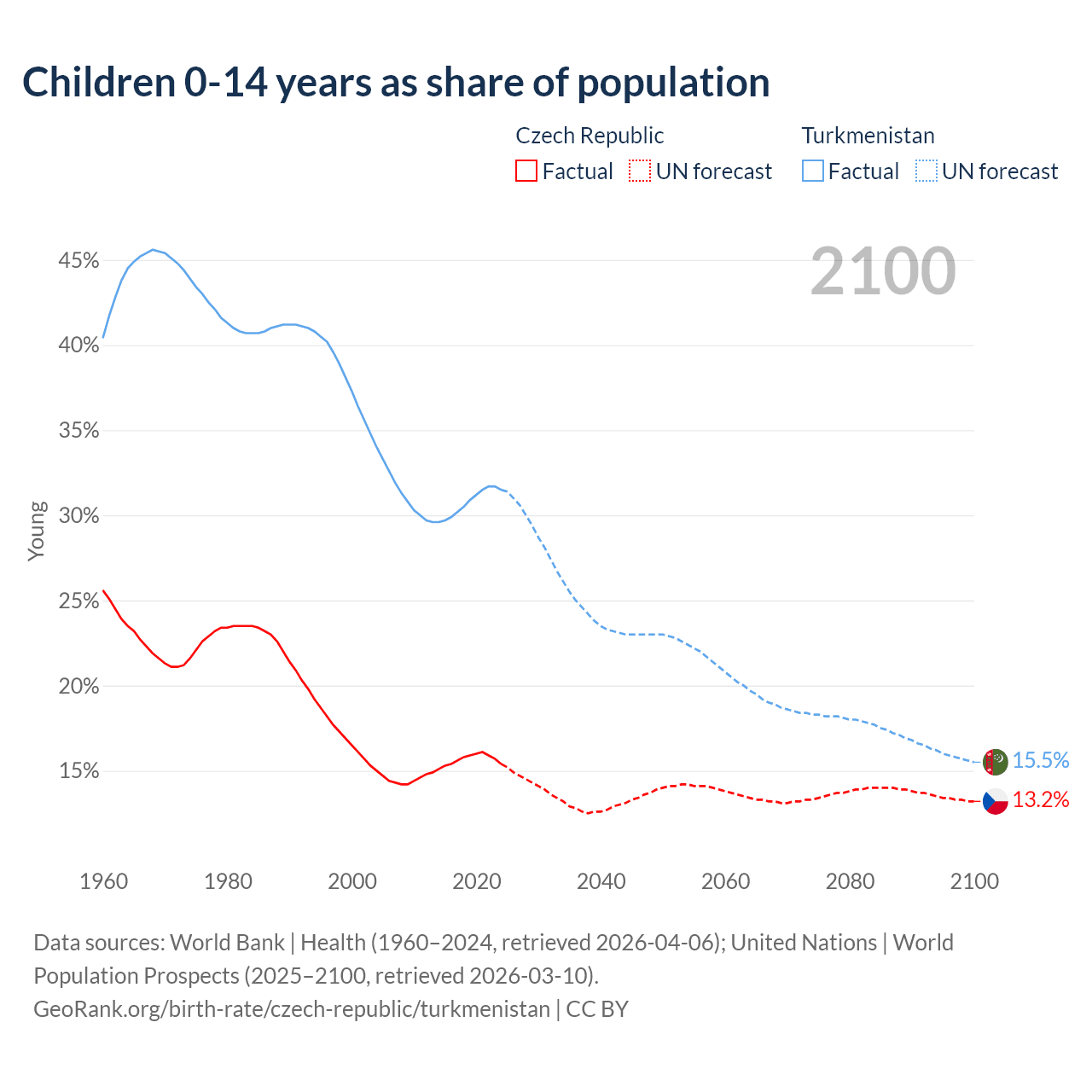 According to the latest available data on birth rates, the fertility rate in the Czech Republic was 1.45 children per woman in 2023, compared to 2.69 in Turkmenistan in 2023. The replacement level is considered to be 2.1 children per woman.