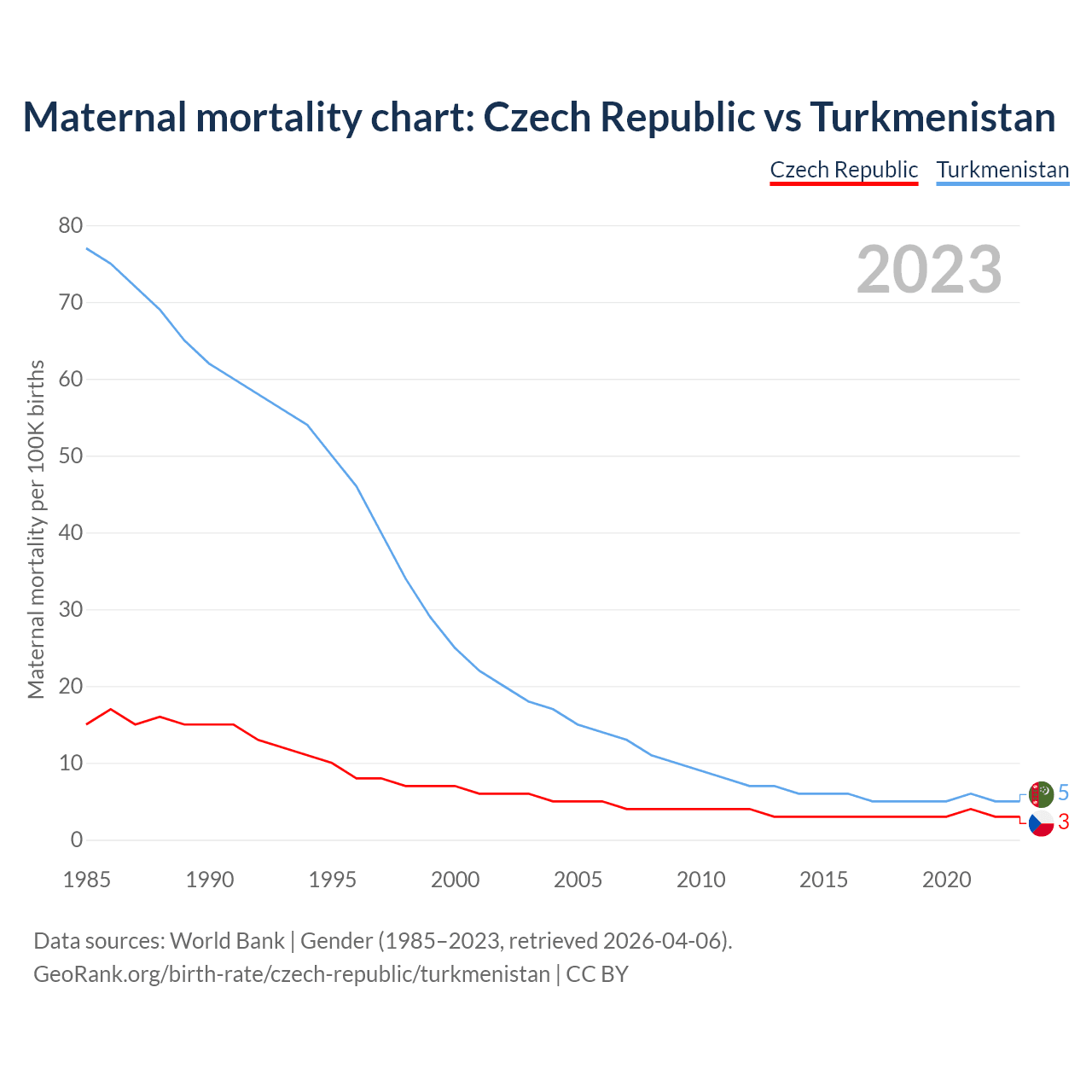The maternal mortality rate, which is the probability of dying during childbirth or within 42 days of pregnancy termination, is 3 deaths per 100,000 live births in the Czech Republic, compared to 5 deaths in Turkmenistan.