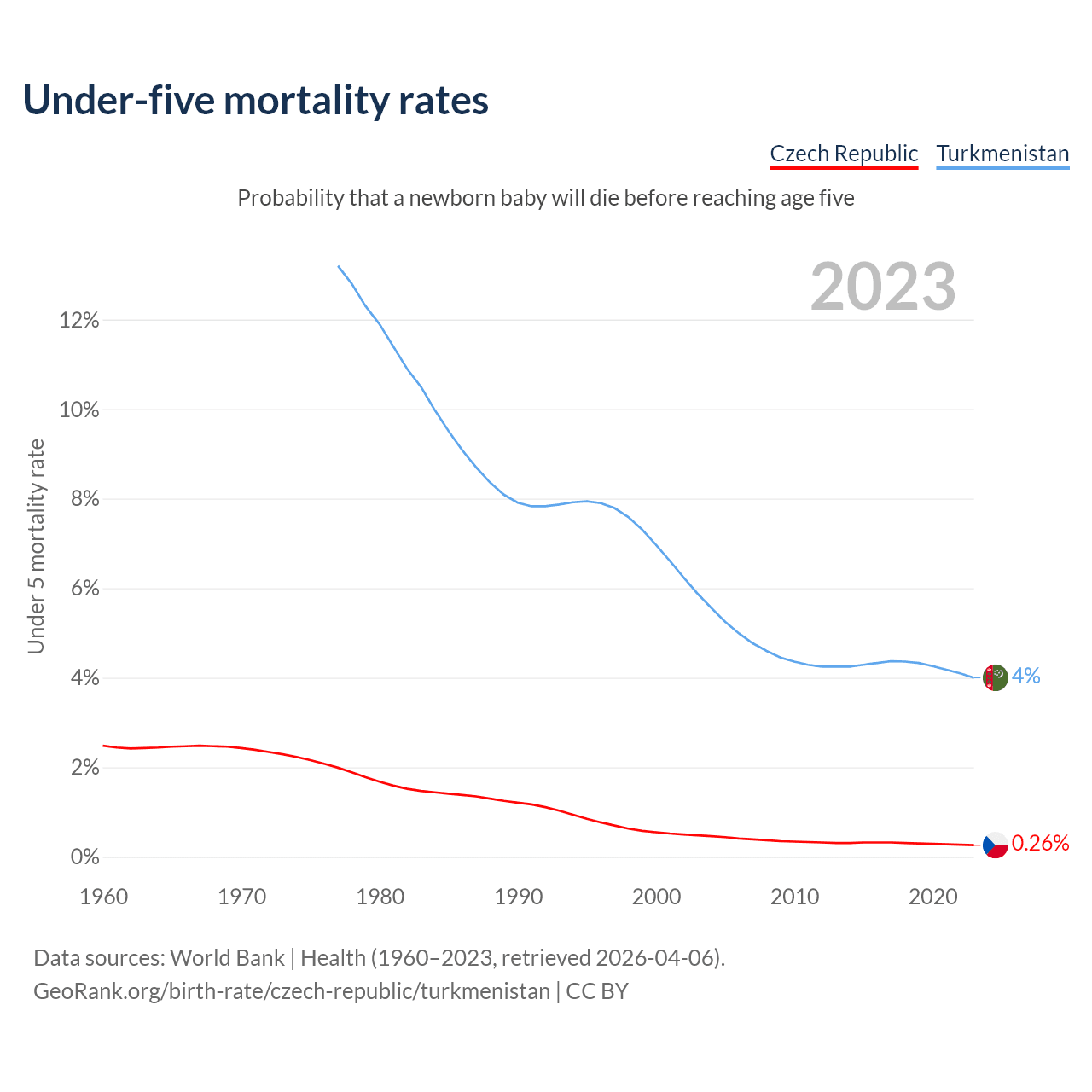The chance that a newborn baby will die before reaching age five is 0.26% in the Czech Republic and 4% in Turkmenistan. Above is a chart with historical data on under-five mortality rates.
