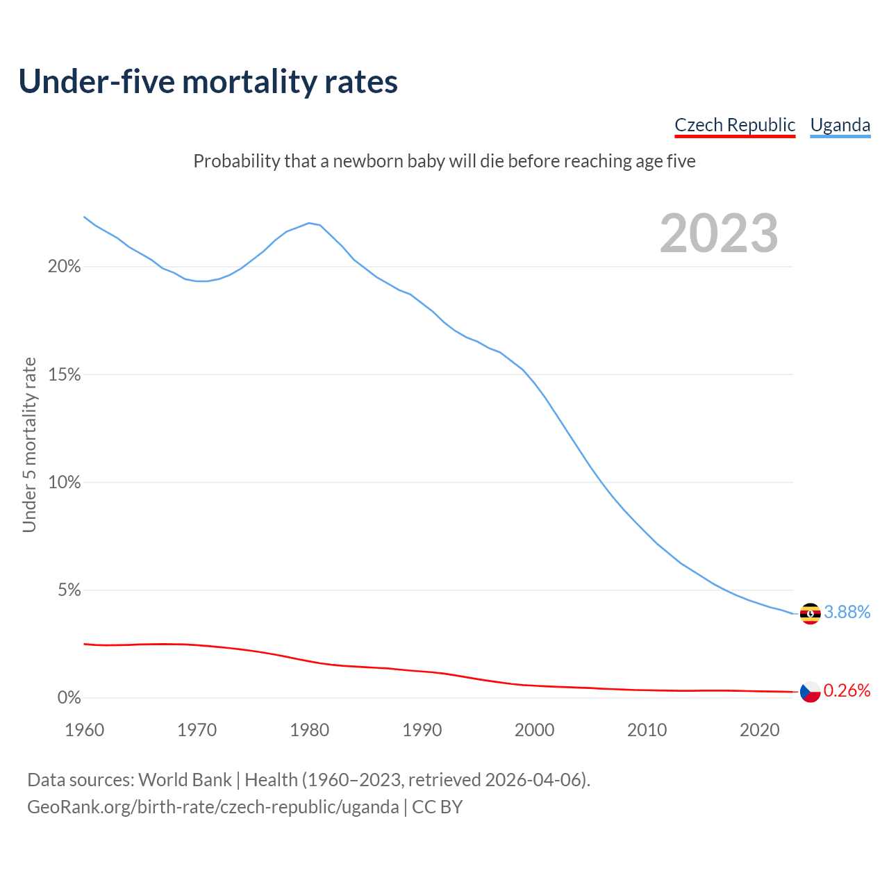 The chance that a newborn baby will die before reaching age five is 0.26% in the Czech Republic and 3.88% in Uganda. Above is a chart with historical data on under-five mortality rates.