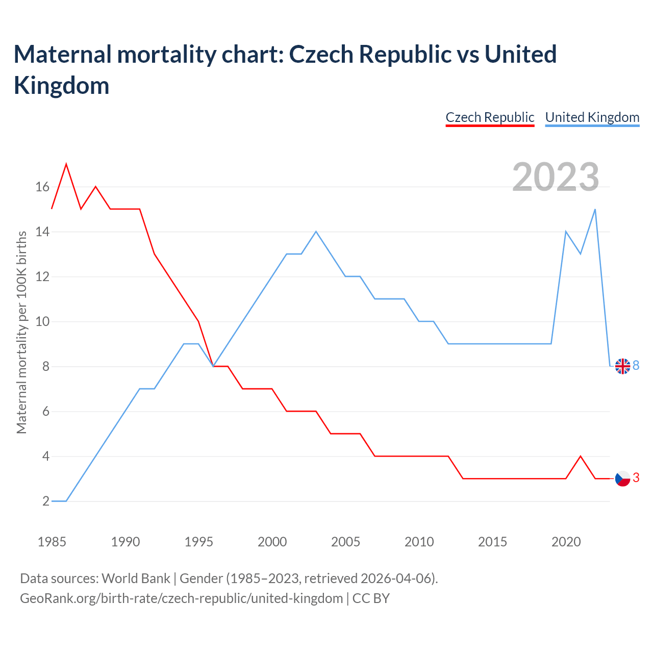 The maternal mortality rate, which is the probability of dying during childbirth or within 42 days of pregnancy termination, is 3 deaths per 100,000 live births in the Czech Republic, compared to 8 deaths in the United Kingdom.