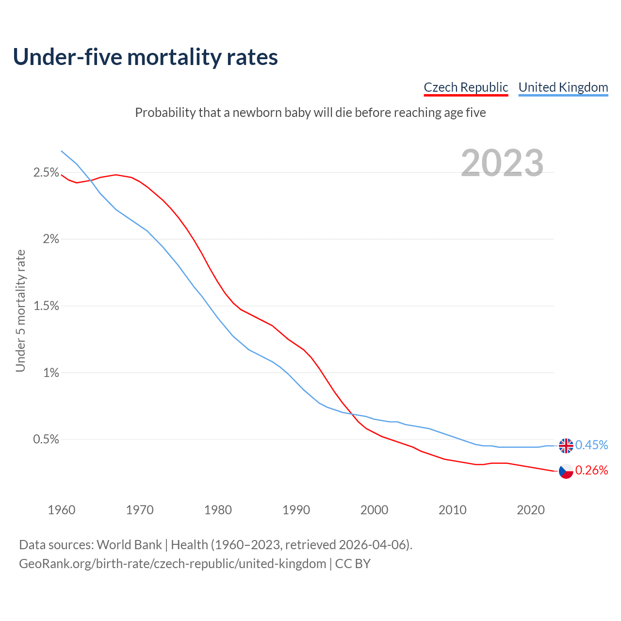 The chance that a newborn baby will die before reaching age five is 0.26% in the Czech Republic and 0.45% in the United Kingdom. Above is a chart with historical data on under-five mortality rates.
