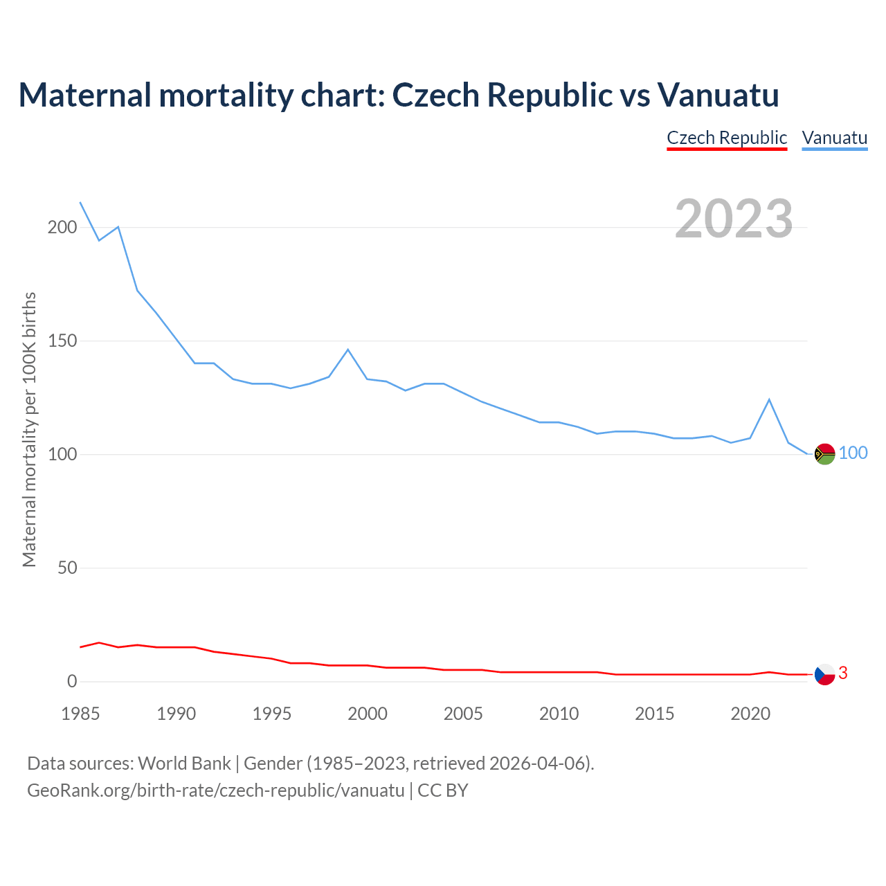 The maternal mortality rate, which is the probability of dying during childbirth or within 42 days of pregnancy termination, is 3 deaths per 100,000 live births in the Czech Republic, compared to 100 deaths in Vanuatu.