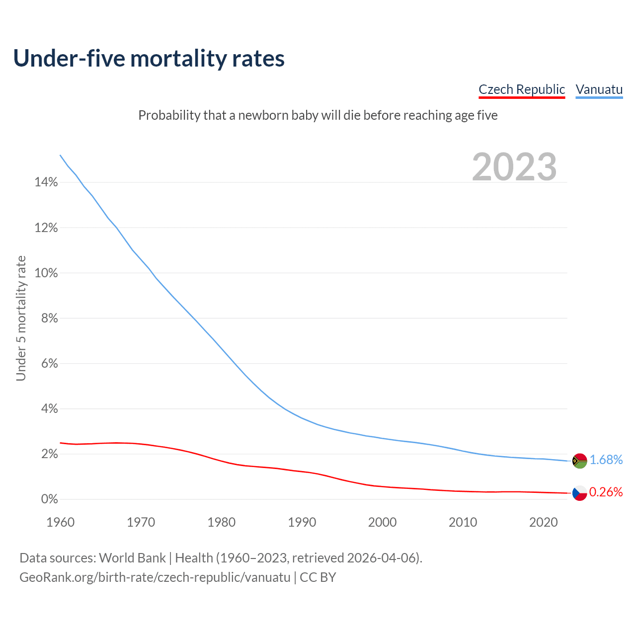 The chance that a newborn baby will die before reaching age five is 0.26% in the Czech Republic and 1.68% in Vanuatu. Above is a chart with historical data on under-five mortality rates.