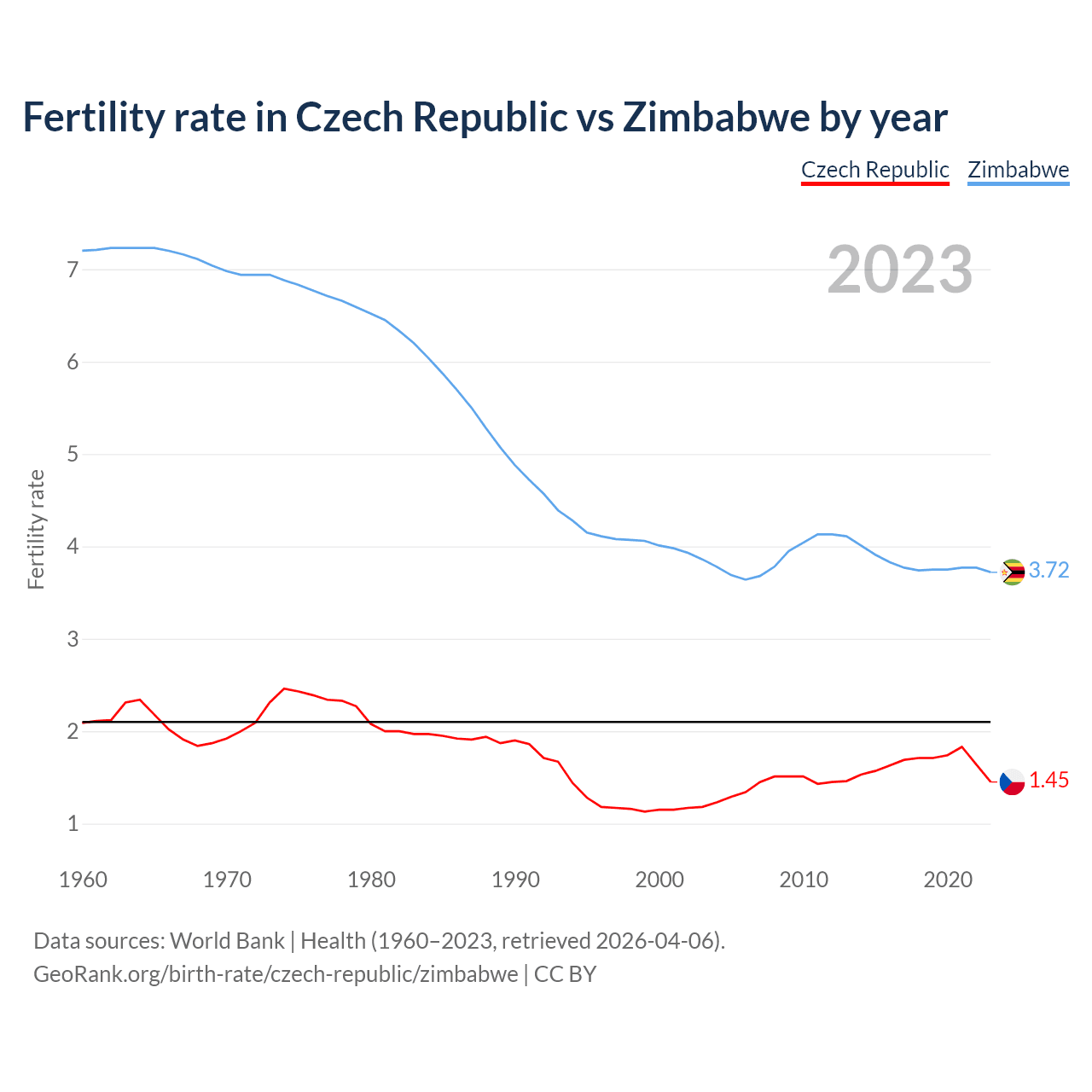 1960 vs 2023, the fertility rate has decreased by 30.6% in the Czech Republic and by 48.2% in Zimbabwe — in 1960, it was 2.09 and 7.2, respectively.