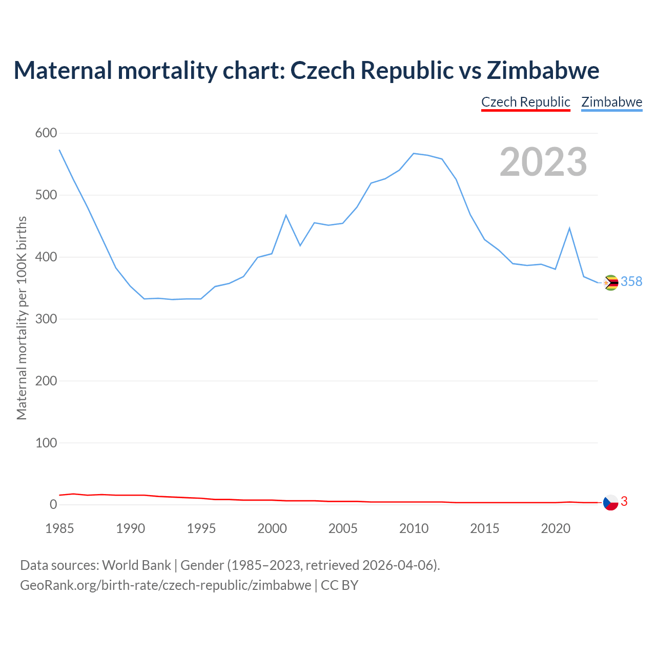 The maternal mortality rate, which is the probability of dying during childbirth or within 42 days of pregnancy termination, is 3 deaths per 100,000 live births in the Czech Republic, compared to 358 deaths in Zimbabwe.