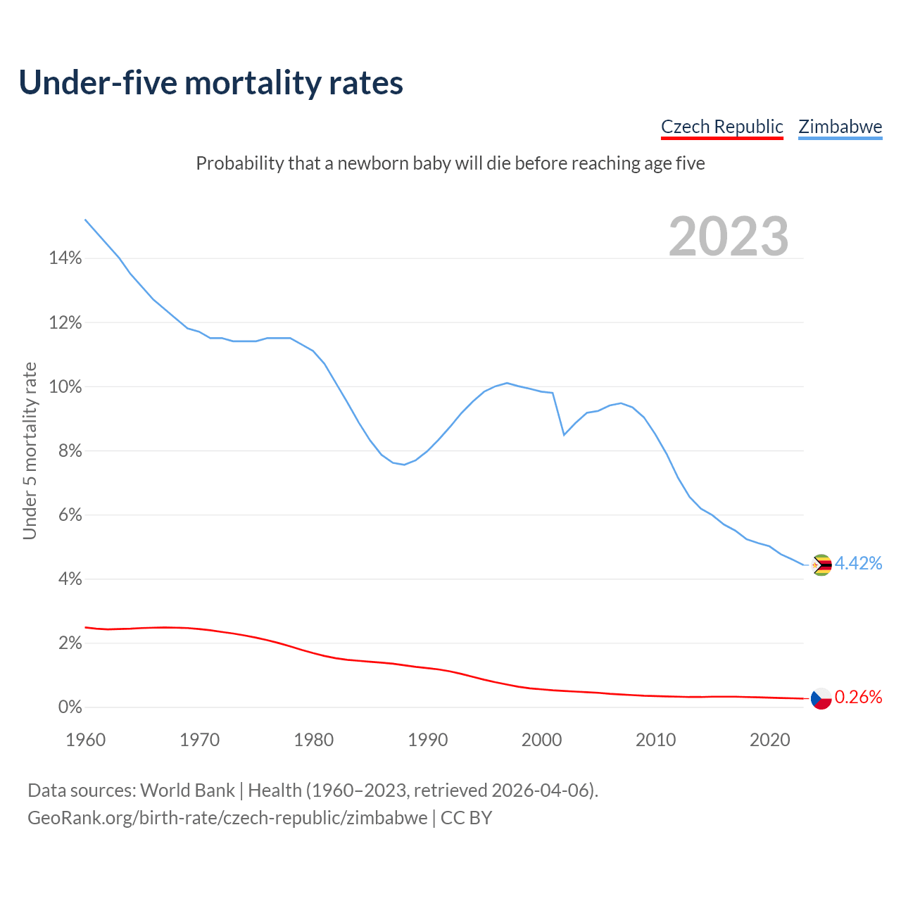 The chance that a newborn baby will die before reaching age five is 0.26% in the Czech Republic and 4.42% in Zimbabwe. Above is a chart with historical data on under-five mortality rates.