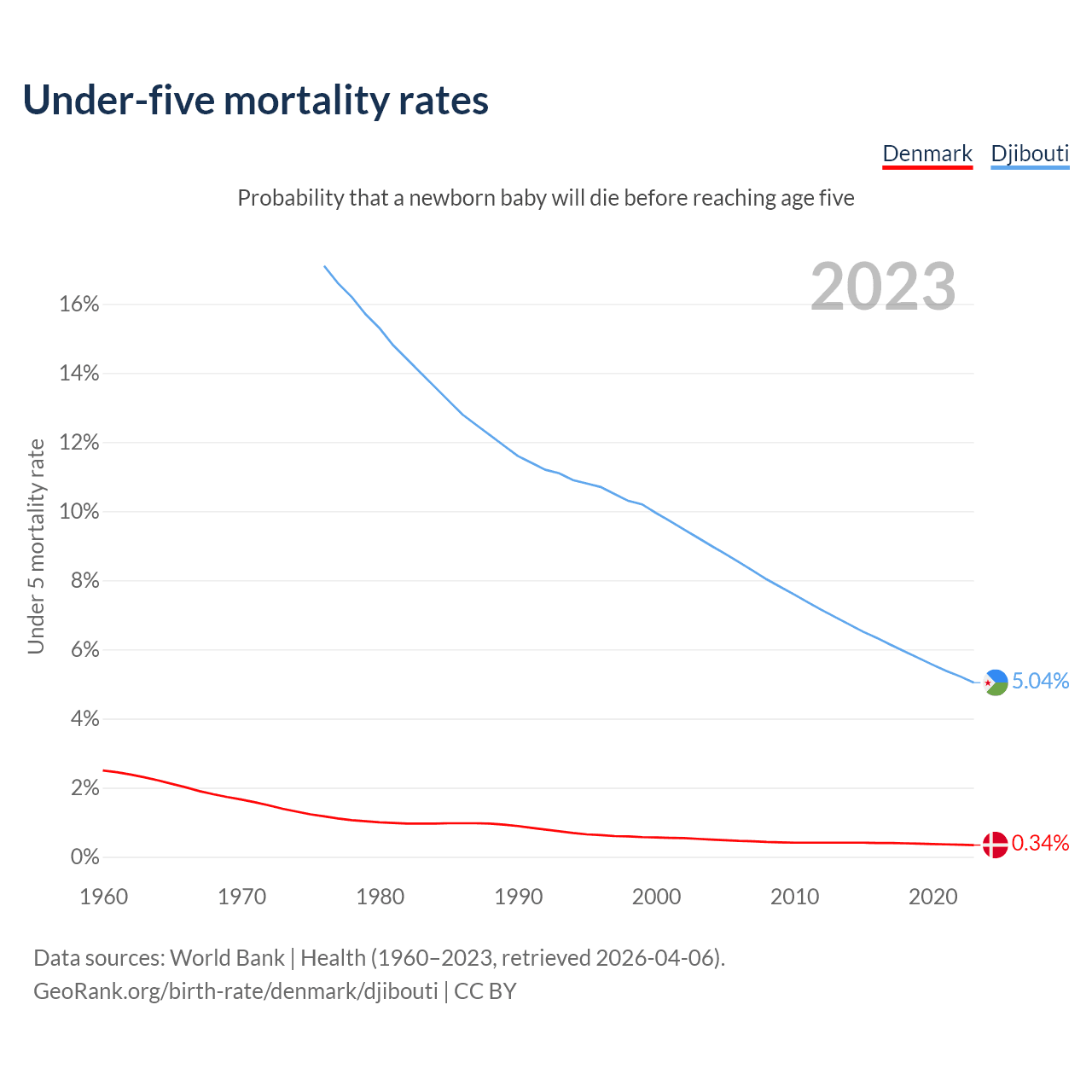 The chance that a newborn baby will die before reaching age five is 0.34% in Denmark and 5.04% in Djibouti. Above is a chart with historical data on under-five mortality rates.