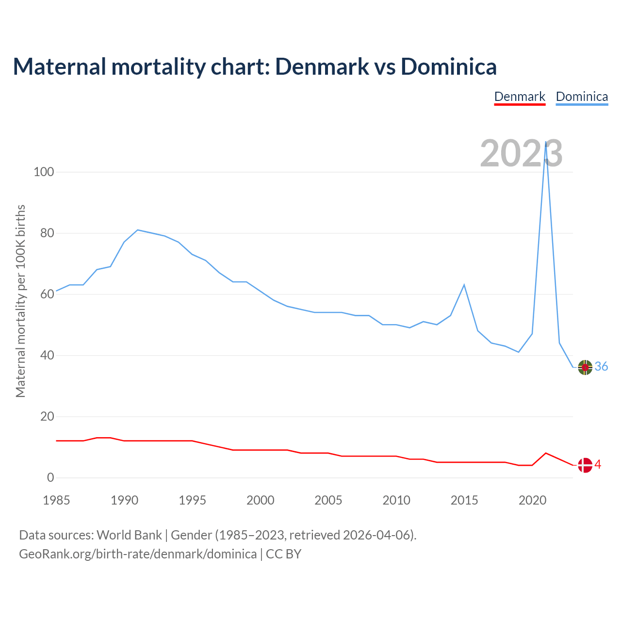 The maternal mortality rate, which is the probability of dying during childbirth or within 42 days of pregnancy termination, is 4 deaths per 100,000 live births in Denmark, compared to 36 deaths in Dominica.