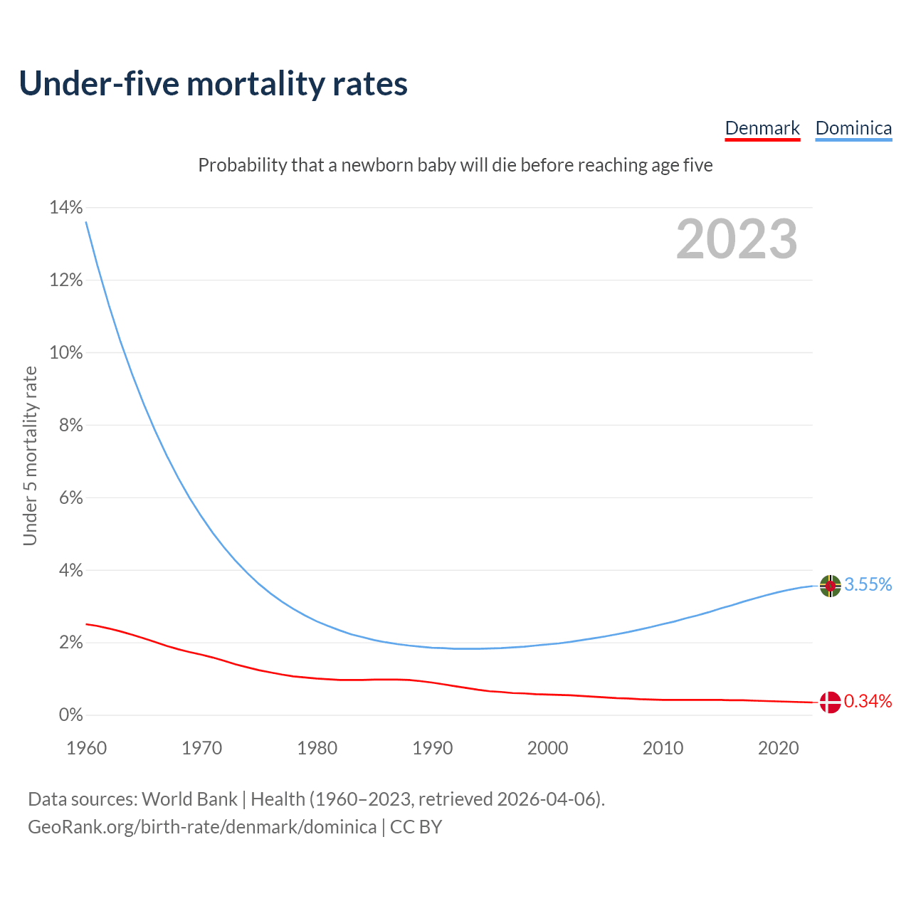 The chance that a newborn baby will die before reaching age five is 0.34% in Denmark and 3.55% in Dominica. Above is a chart with historical data on under-five mortality rates.