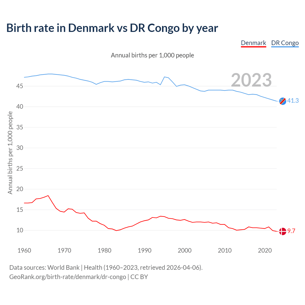 Denmark has an annual birth rate of 9.7 births per 1,000 people, compared to 41.3 for the DR Congo. The average number of children a woman is expected to have during her lifetime — the fertility rate, is 1.5 in Denmark and 6.05 in the DR Congo — 303% difference.