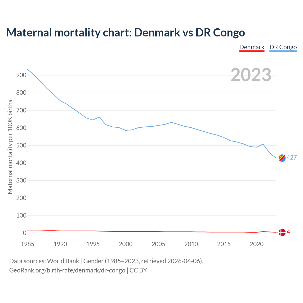 The maternal mortality rate, which is the probability of dying during childbirth or within 42 days of pregnancy termination, is 4 deaths per 100,000 live births in Denmark, compared to 427 deaths in the DR Congo.