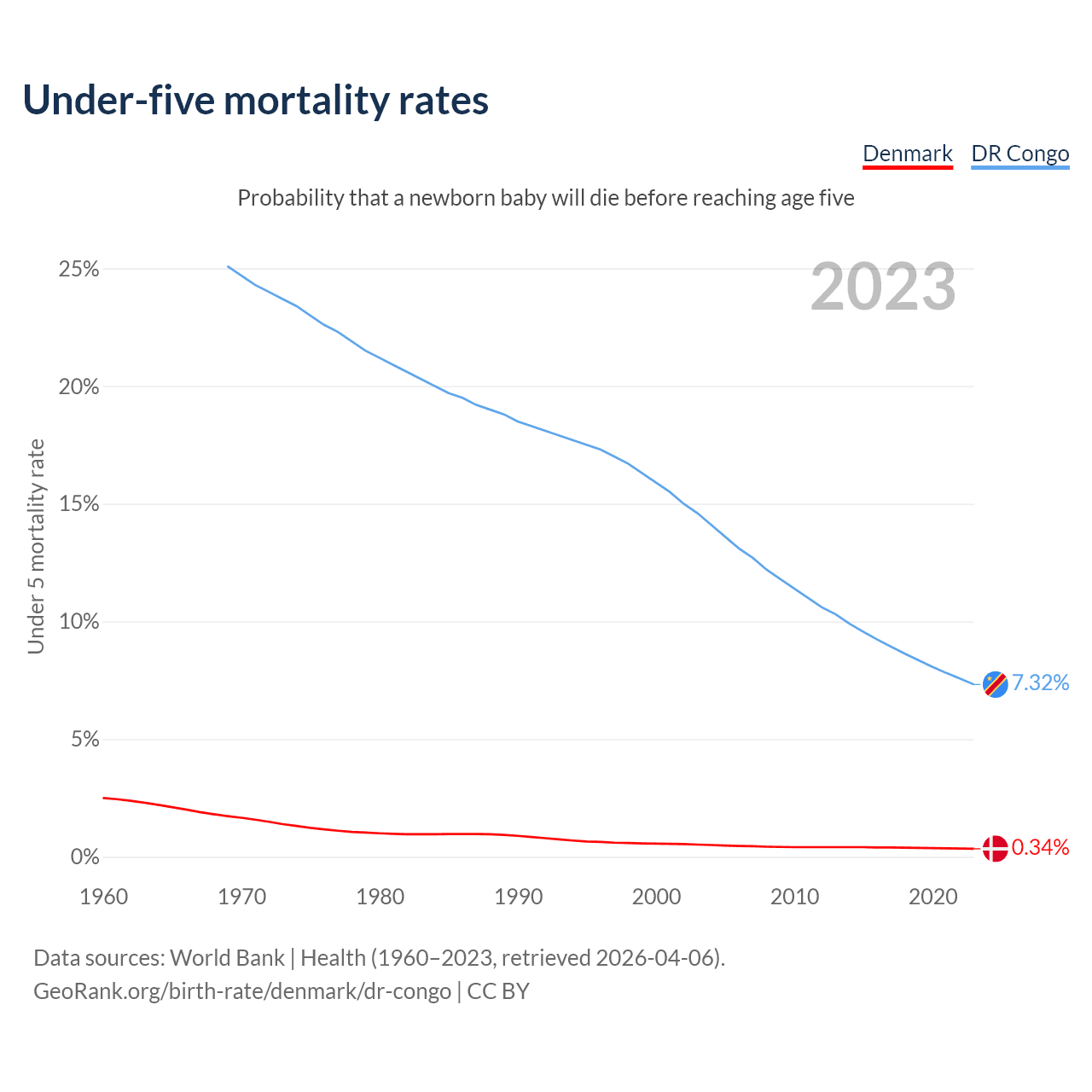 The chance that a newborn baby will die before reaching age five is 0.34% in Denmark and 7.32% in the DR Congo. Above is a chart with historical data on under-five mortality rates.