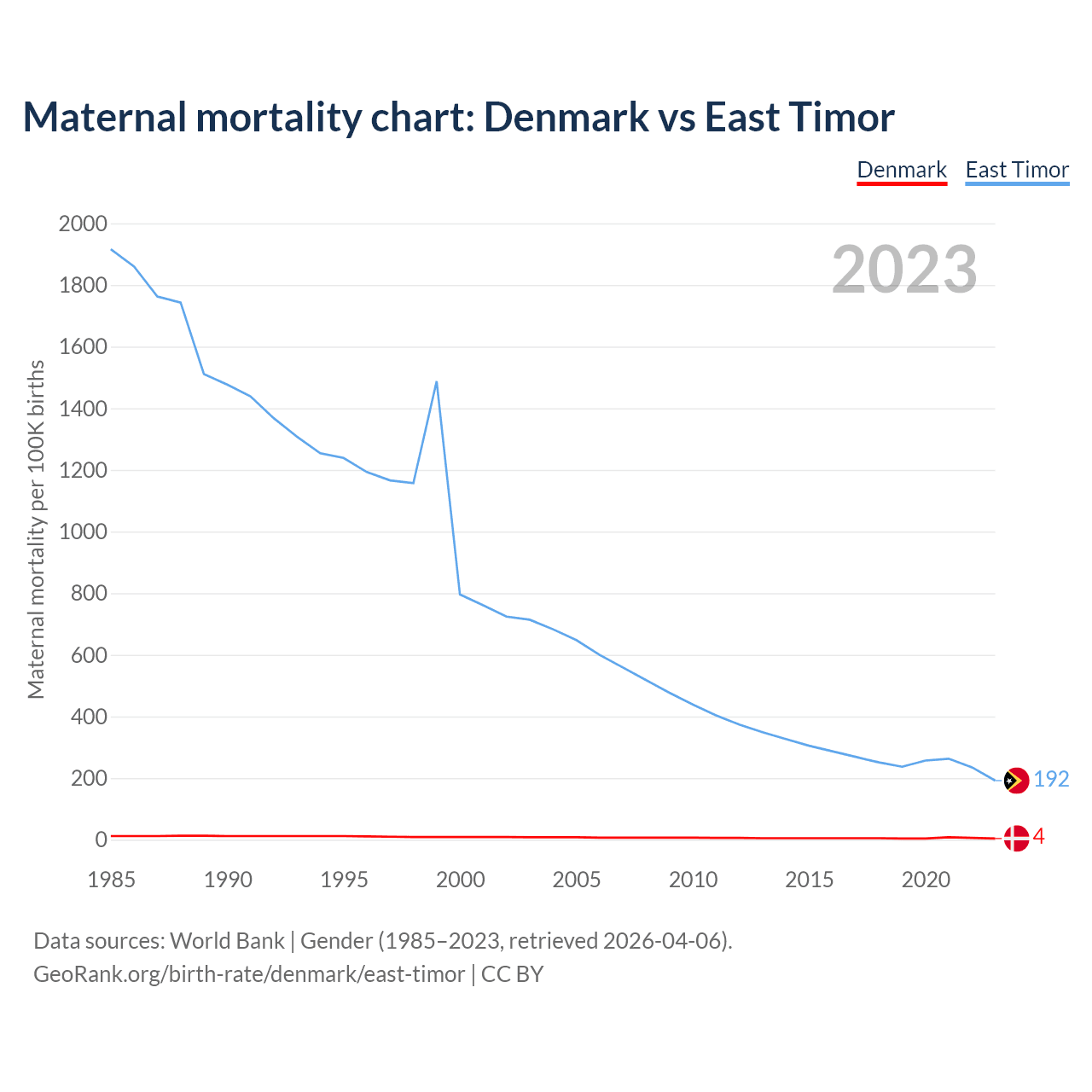 The maternal mortality rate, which is the probability of dying during childbirth or within 42 days of pregnancy termination, is 4 deaths per 100,000 live births in Denmark, compared to 192 deaths in East Timor.
