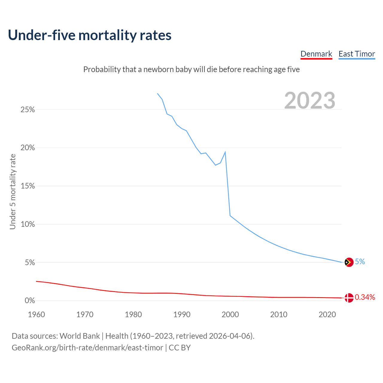 The chance that a newborn baby will die before reaching age five is 0.34% in Denmark and 5% in East Timor. Above is a chart with historical data on under-five mortality rates.