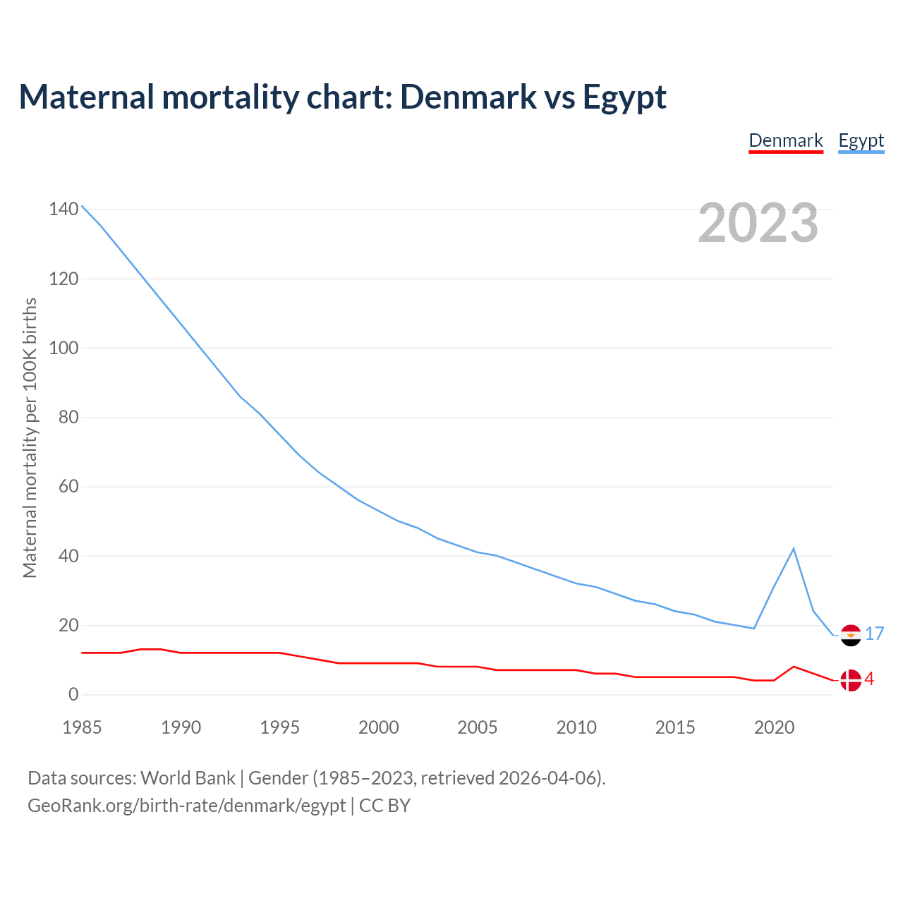 The maternal mortality rate, which is the probability of dying during childbirth or within 42 days of pregnancy termination, is 4 deaths per 100,000 live births in Denmark, compared to 17 deaths in Egypt.