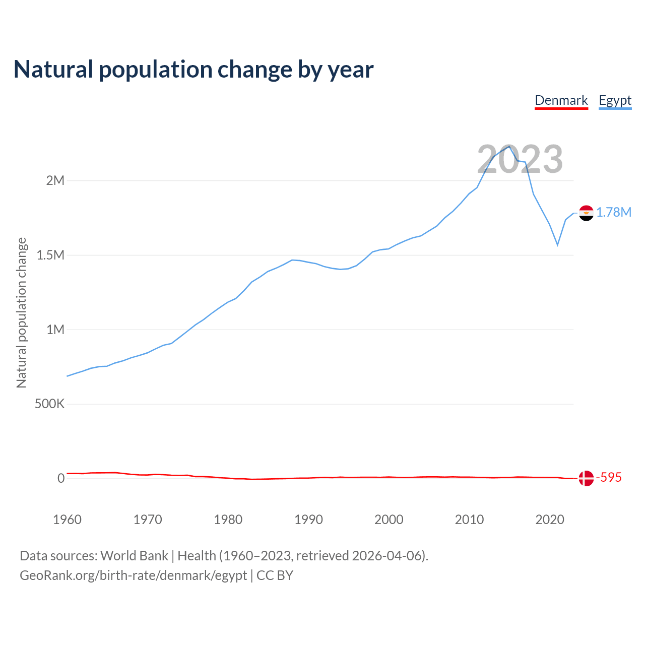According to the latest available data on birth rates, the fertility rate in Denmark was 1.5 children per woman in 2023, compared to 2.75 in Egypt in 2023. The replacement level is considered to be 2.1 children per woman.