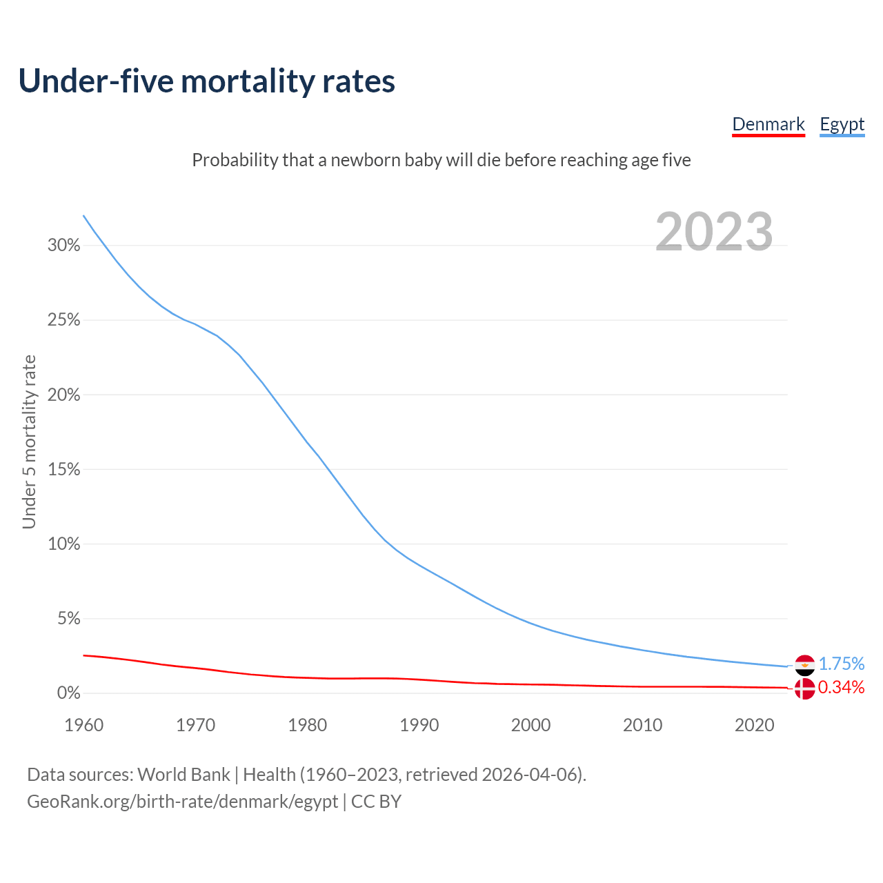 The chance that a newborn baby will die before reaching age five is 0.34% in Denmark and 1.75% in Egypt. Above is a chart with historical data on under-five mortality rates.