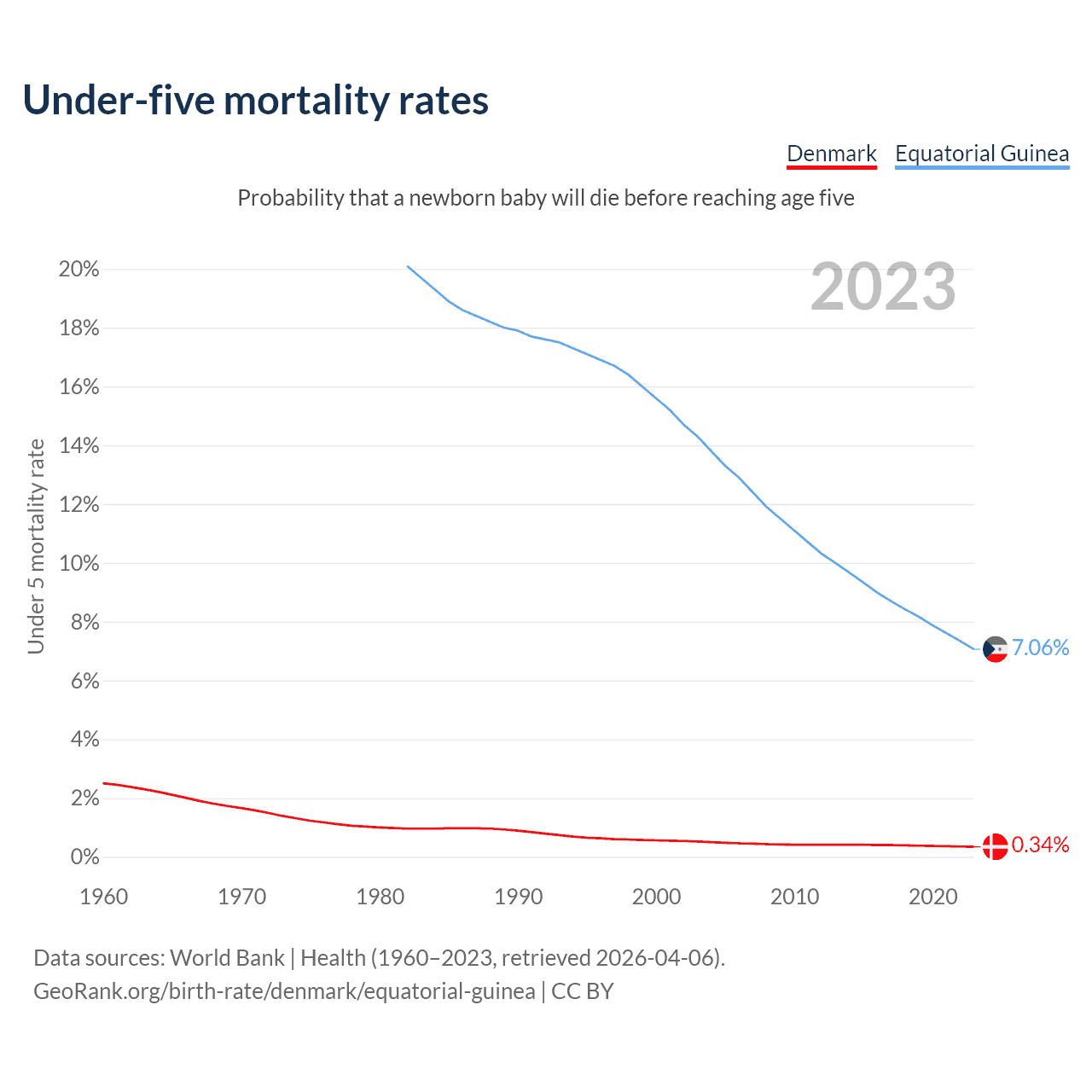 The chance that a newborn baby will die before reaching age five is 0.34% in Denmark and 7.06% in Equatorial Guinea. Above is a chart with historical data on under-five mortality rates.