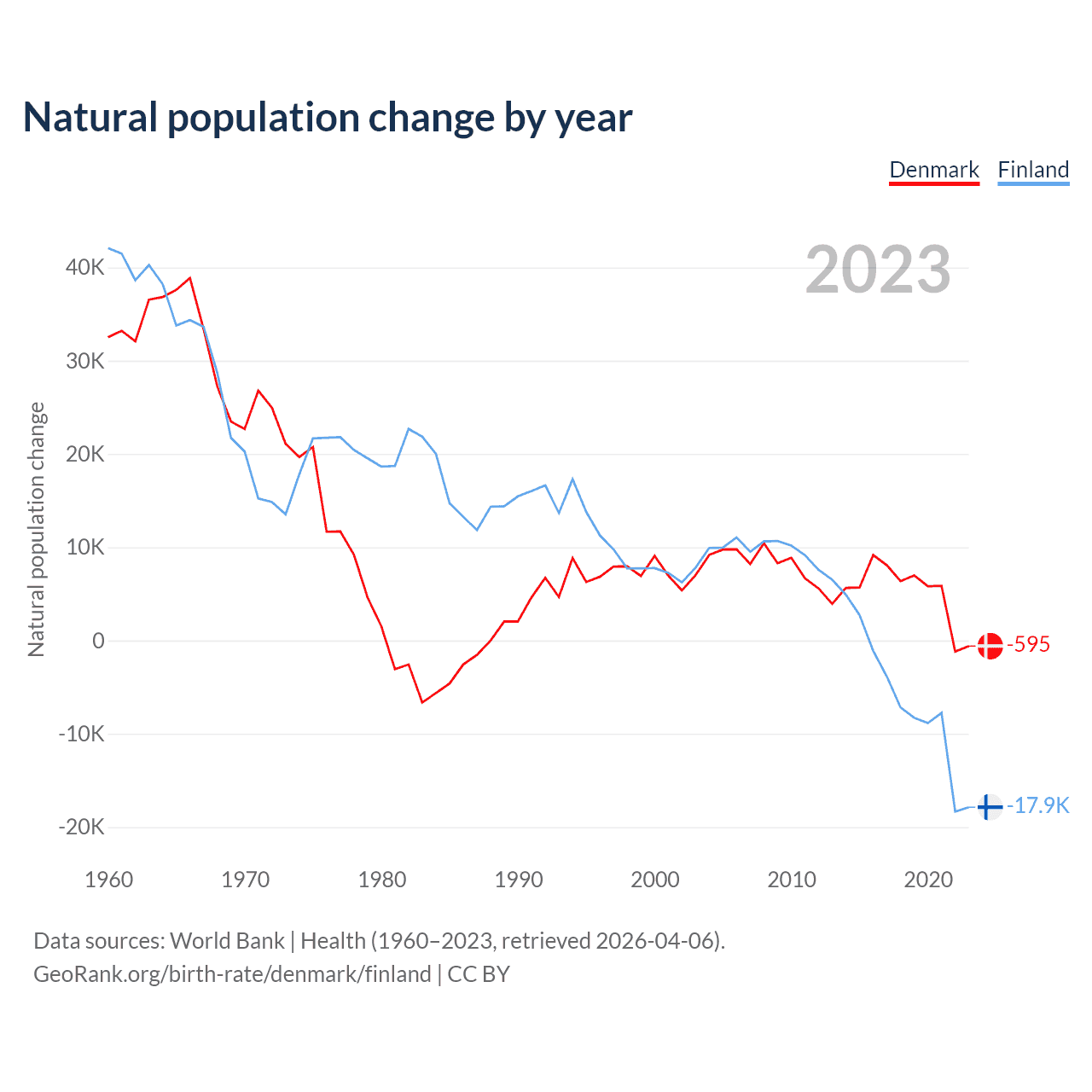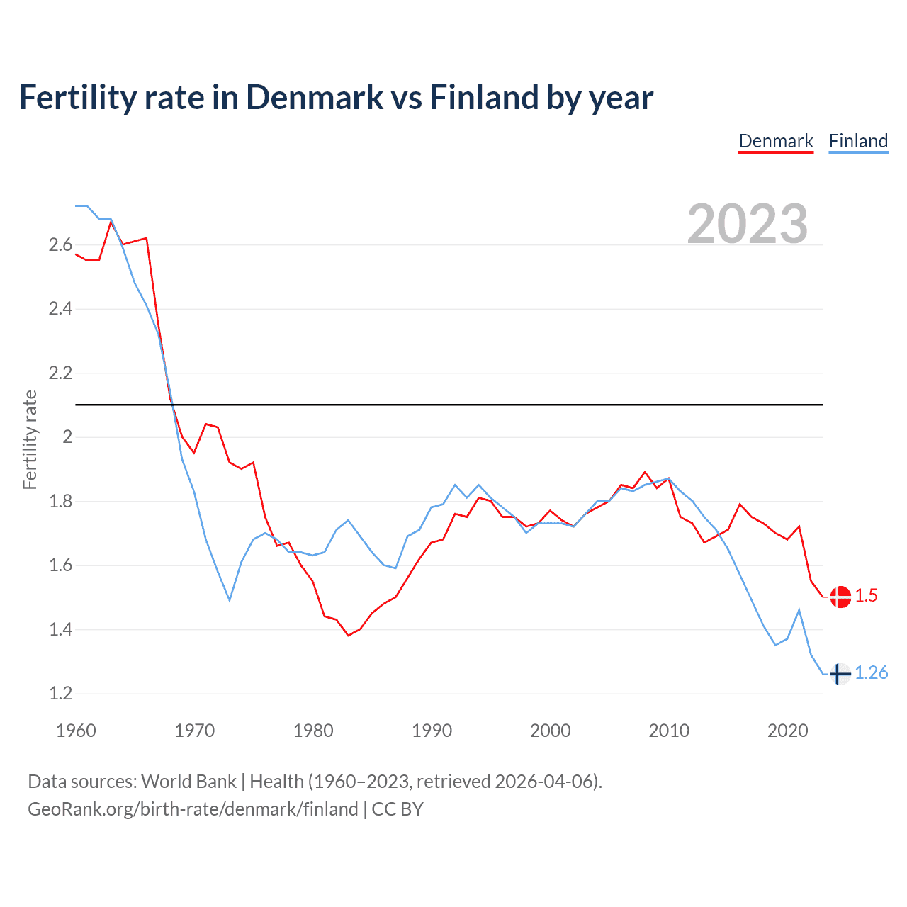 According to the latest available data on birth rates, the fertility rate in Denmark was 1.5 children per woman in 2023, compared to 1.26 in Finland in 2023. The replacement level is considered to be 2.1 children per woman.