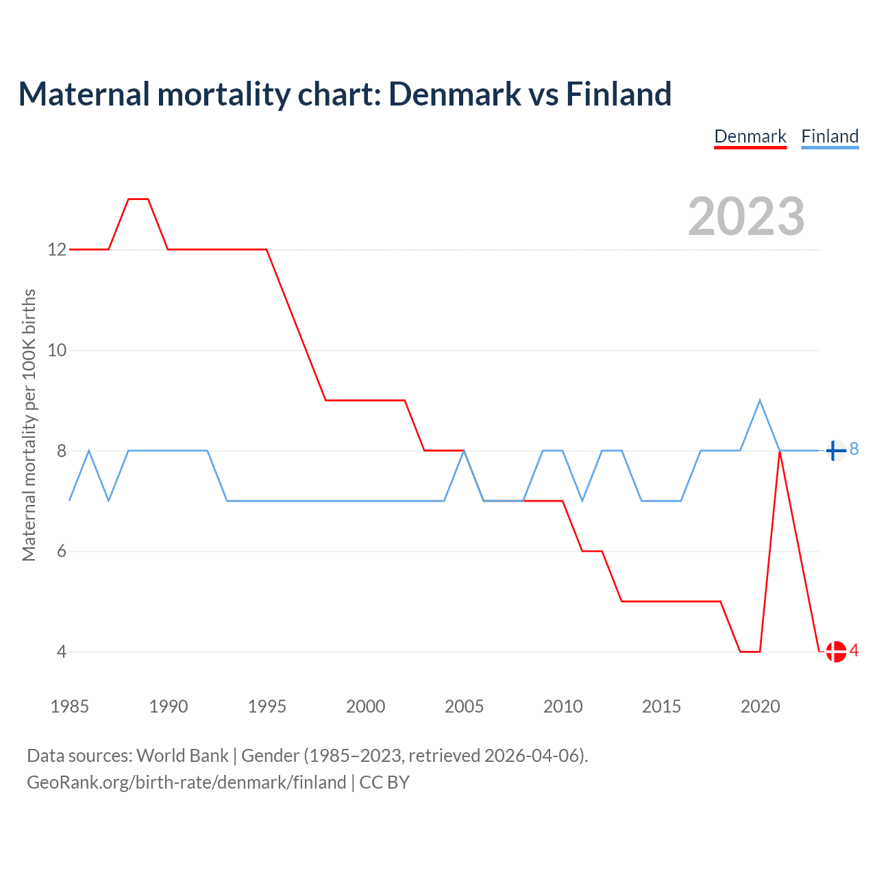 The maternal mortality rate, which is the probability of dying during childbirth or within 42 days of pregnancy termination, is 4 deaths per 100,000 live births in Denmark, compared to 8 deaths in Finland.