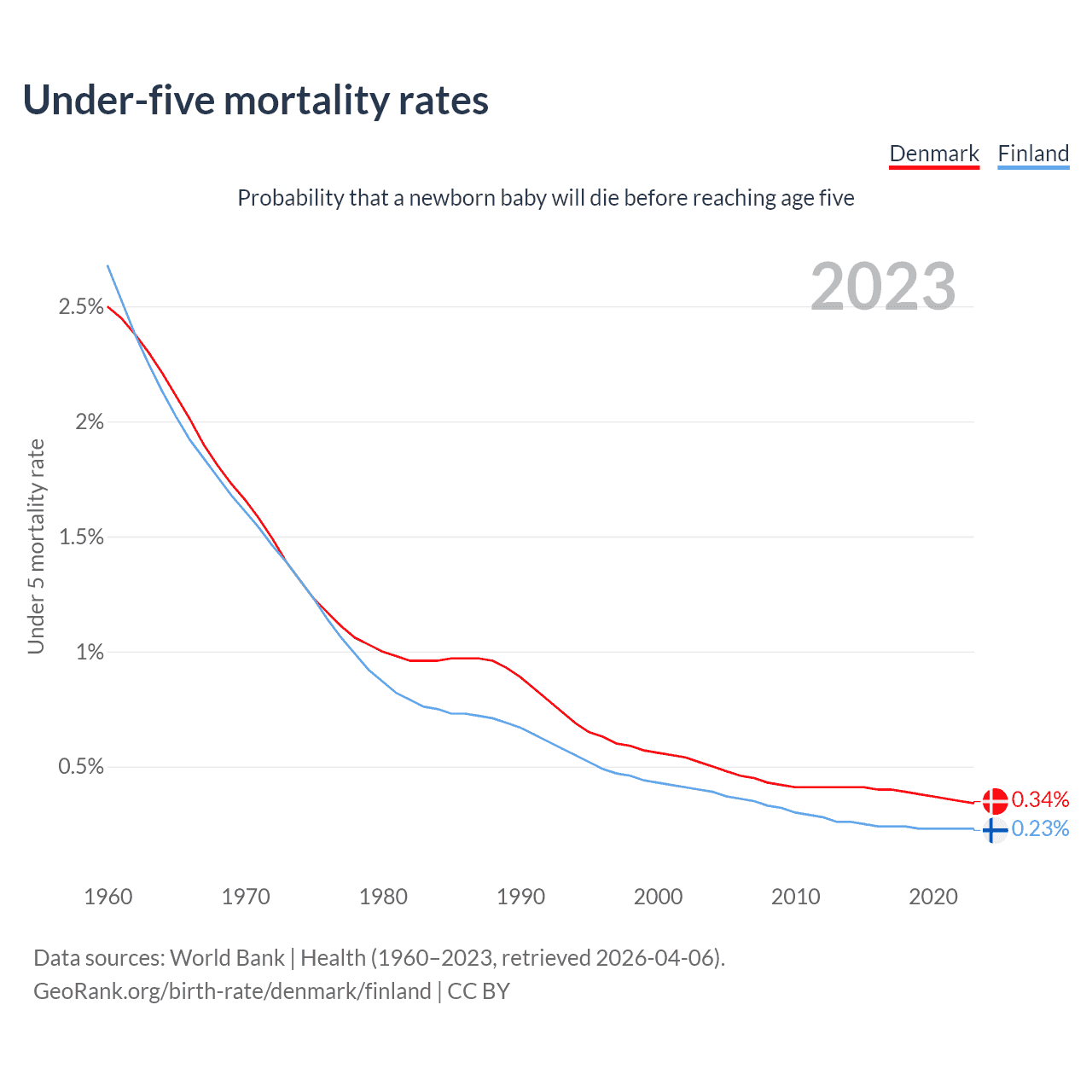 The chance that a newborn baby will die before reaching age five is 0.34% in Denmark and 0.23% in Finland. Above is a chart with historical data on under-five mortality rates.
