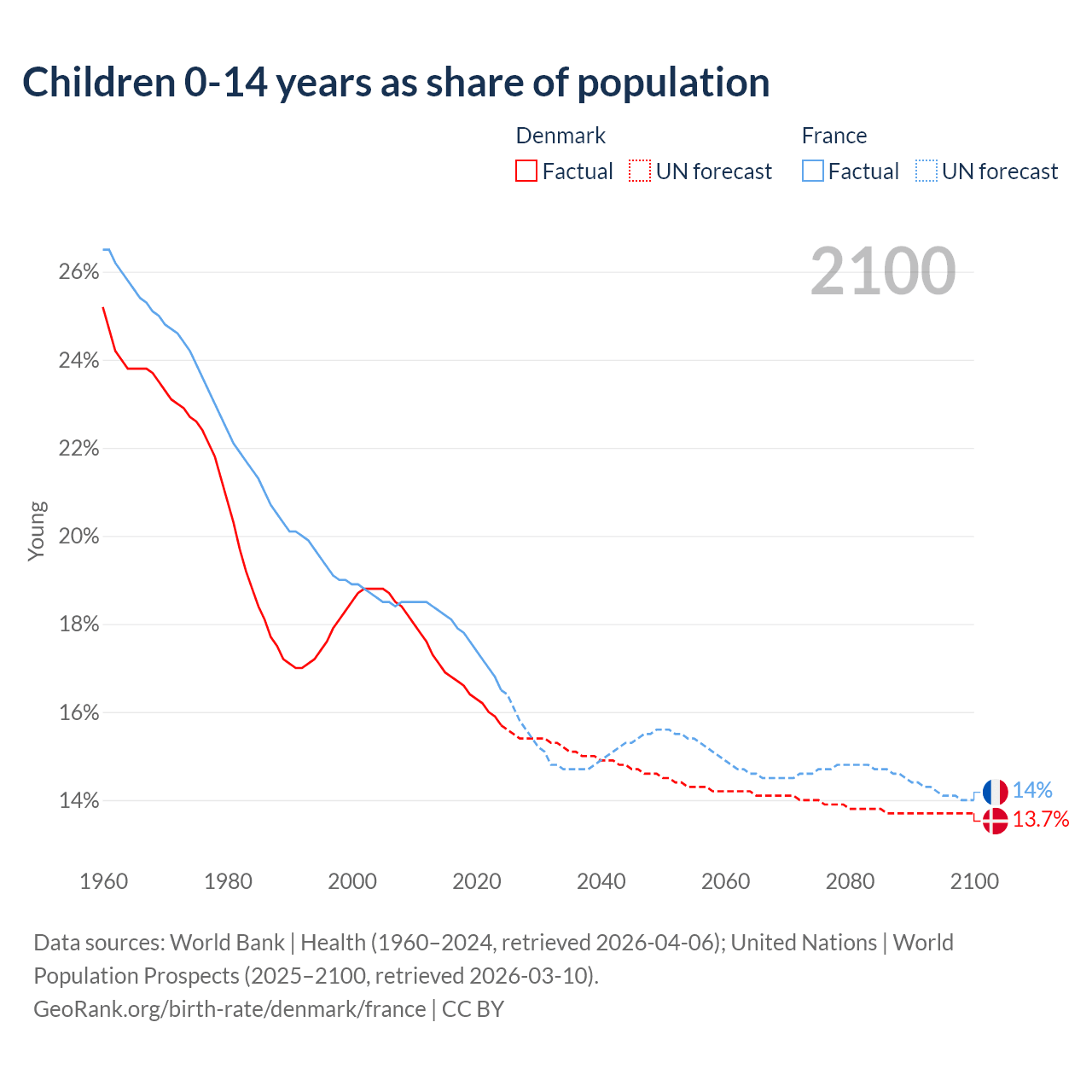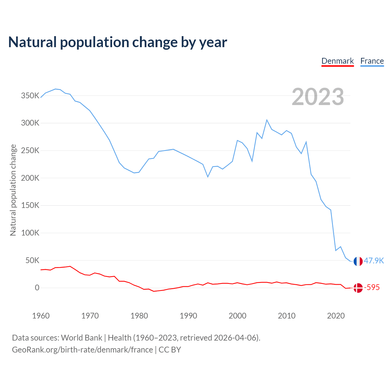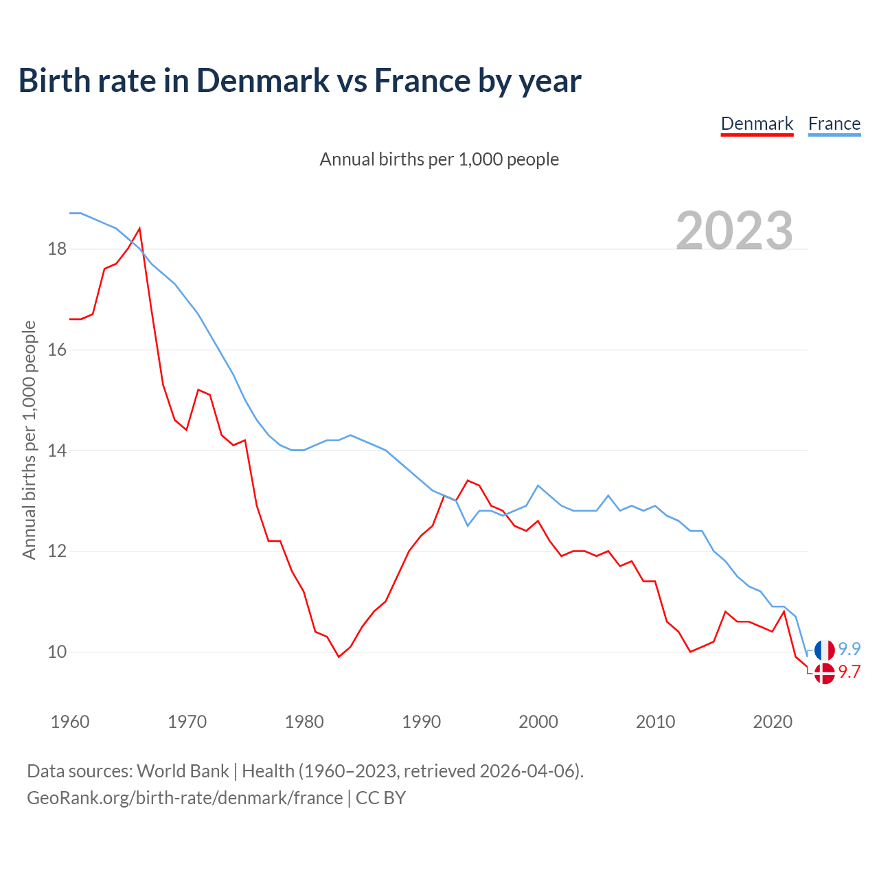 Denmark has an annual birth rate of 9.7 births per 1,000 people, compared to 9.9 for France. The average number of children a woman is expected to have during her lifetime — the fertility rate, is 1.5 in Denmark and 1.66 in France — 10.7% difference.