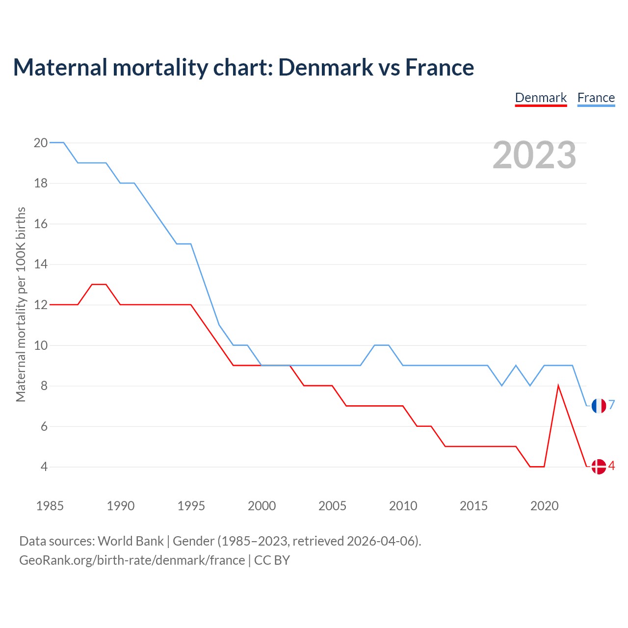 The maternal mortality rate, which is the probability of dying during childbirth or within 42 days of pregnancy termination, is 4 deaths per 100,000 live births in Denmark, compared to 7 deaths in France.