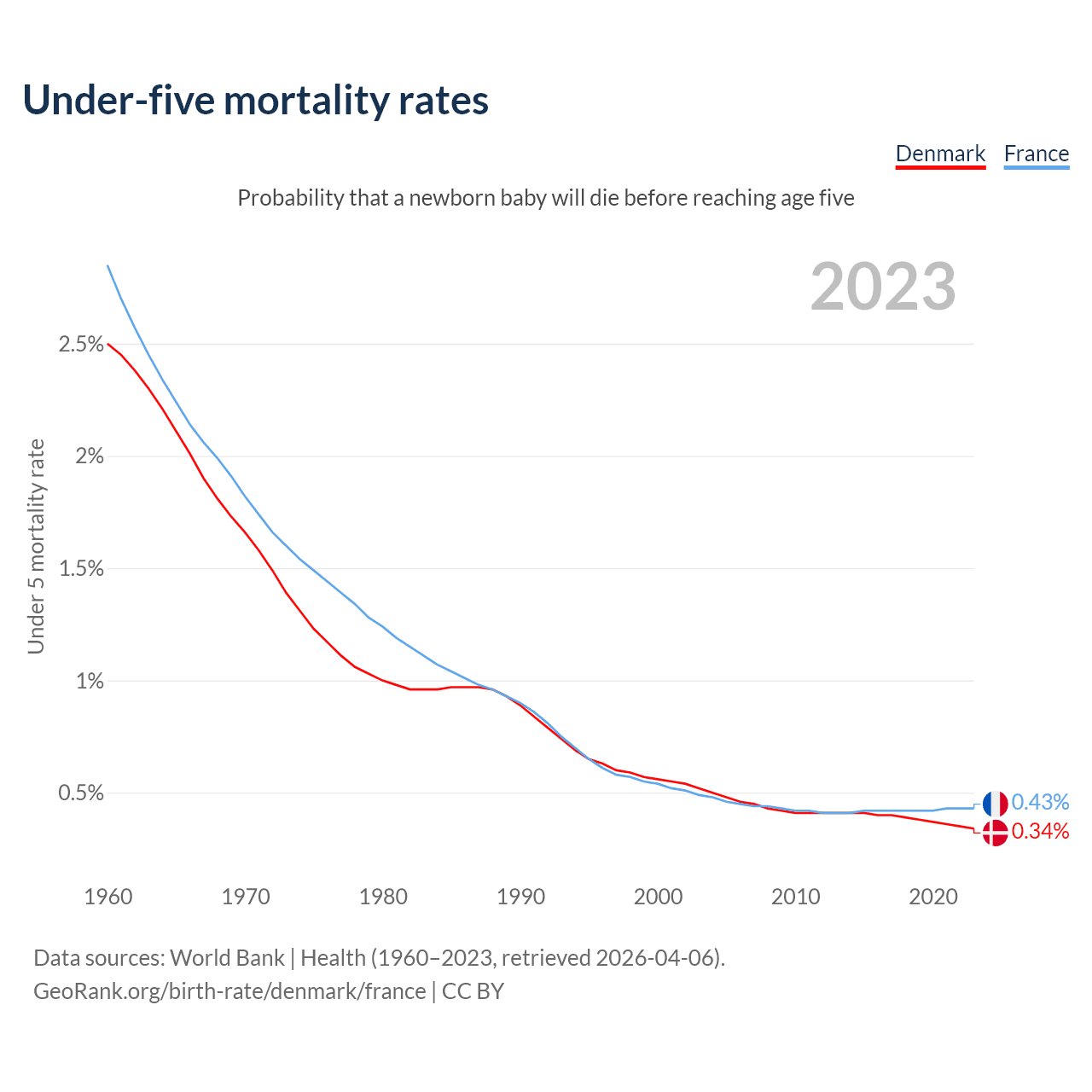 The chance that a newborn baby will die before reaching age five is 0.34% in Denmark and 0.43% in France. Above is a chart with historical data on under-five mortality rates.