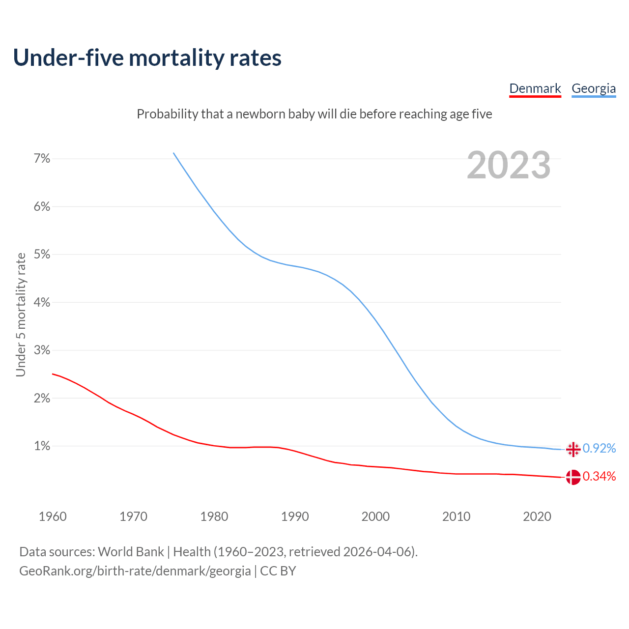 The chance that a newborn baby will die before reaching age five is 0.34% in Denmark and 0.92% in Georgia. Above is a chart with historical data on under-five mortality rates.
